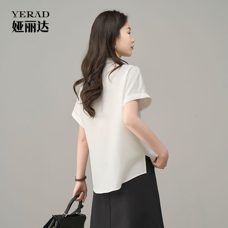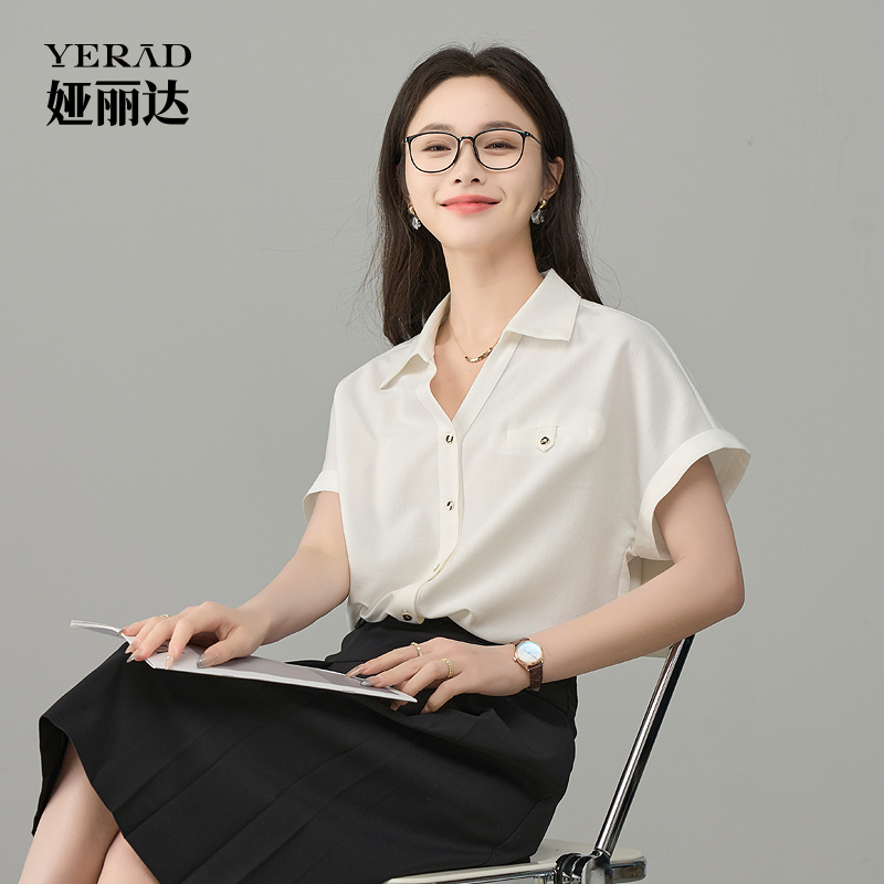 娅丽达气质通勤白色短袖衬衫女2025夏季新款洋气别致v领宽松衬衣
