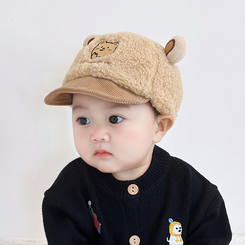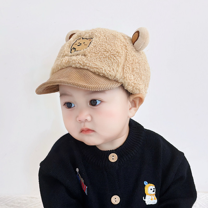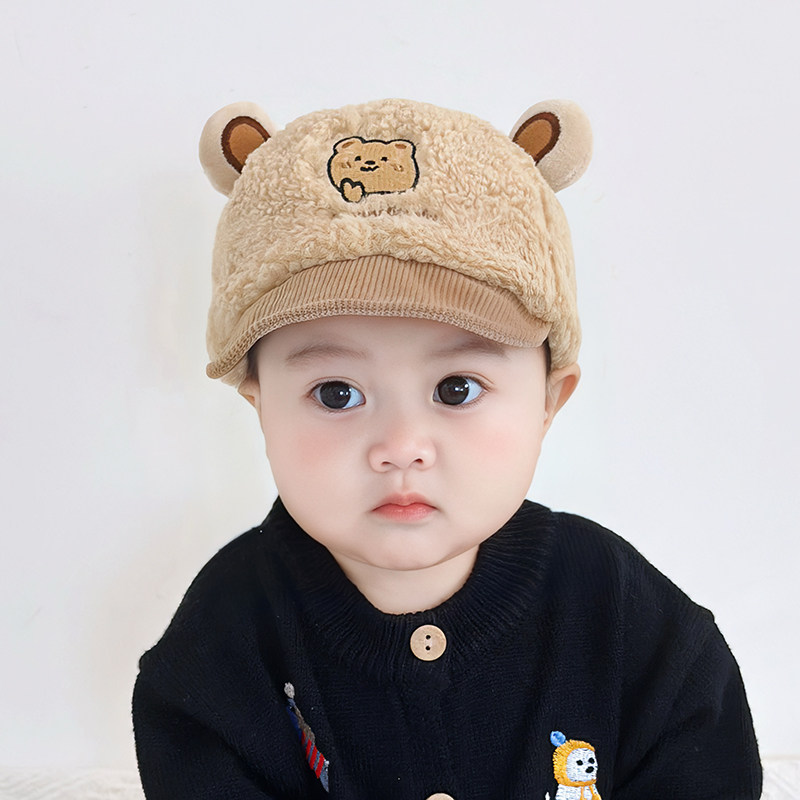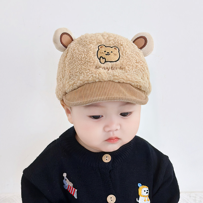婴儿帽子秋冬季女宝加厚保暖羊羔毛鸭舌帽男宝超萌小熊软檐棒球帽