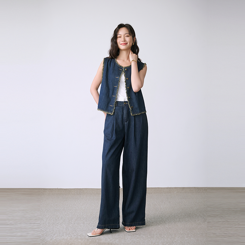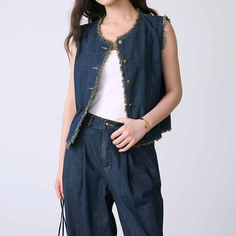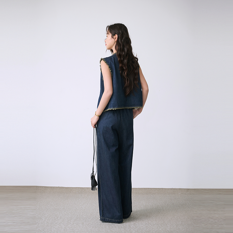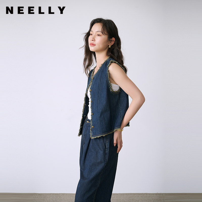 NEELLY纳俪商场同款夏季新款时尚复古牛仔套装女毛边高级感两件套