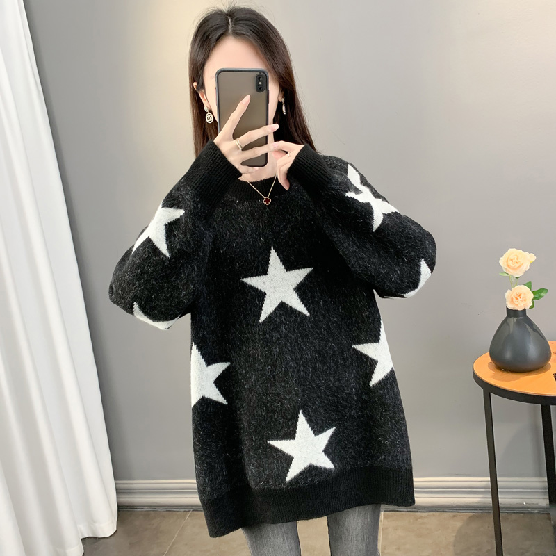 2025秋冬新款韩版满印五角星宽松慵懒风中长款宽松毛衣女套头加厚