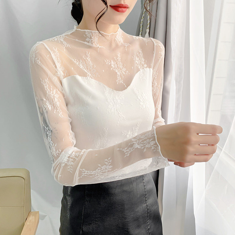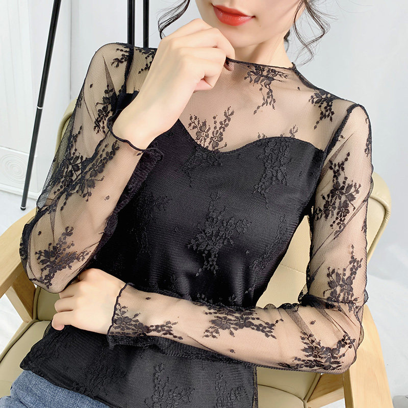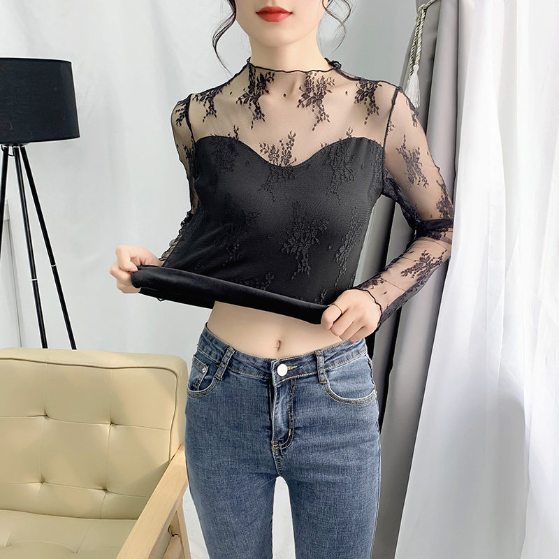 加绒加厚蕾丝长袖网纱洋气内搭打底衫2020秋冬新款韩版性感上衣女