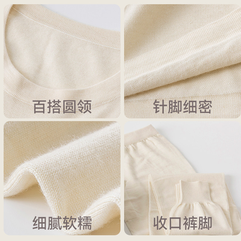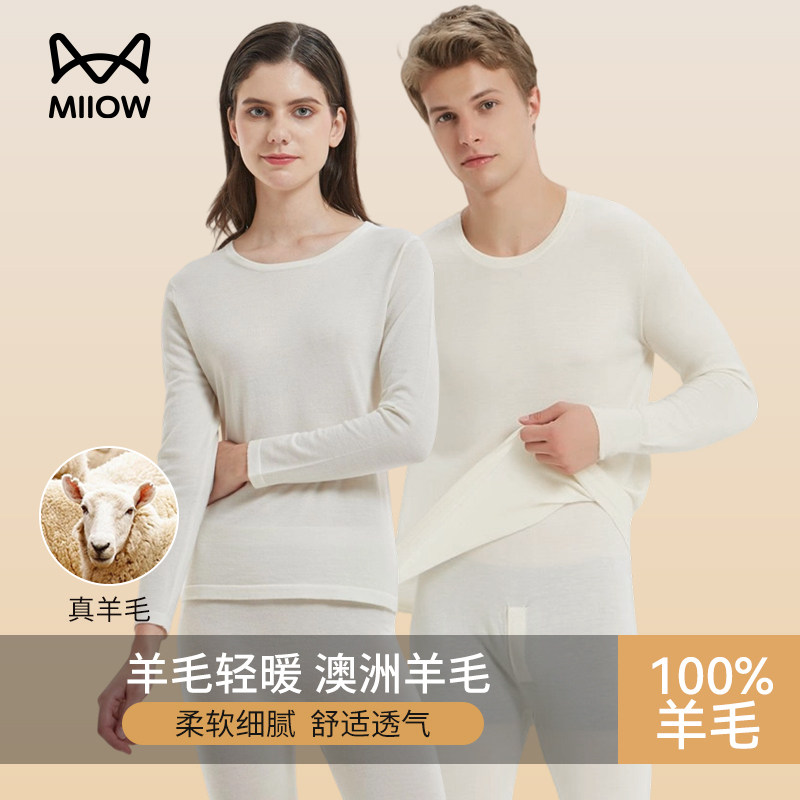 猫人100%纯羊毛秋衣秋裤男秋冬季女士薄款无痕修紧身保暖内衣套装