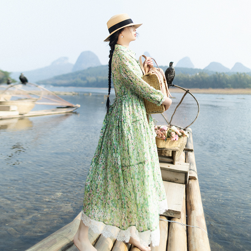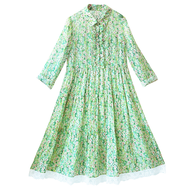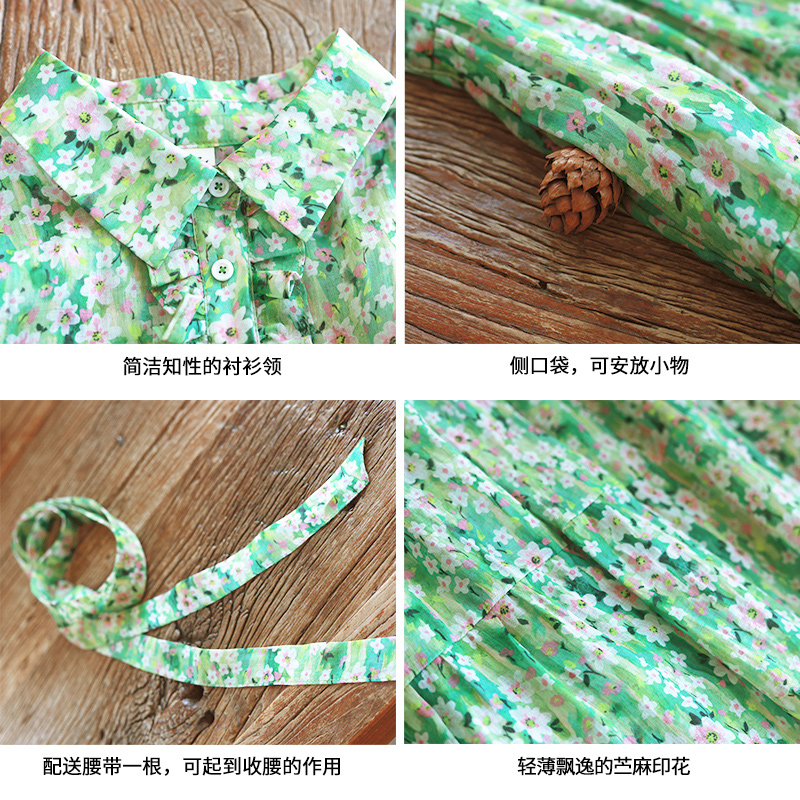 5折【碧叶层层】文艺碎花衬衫连衣裙女春季轻薄苎麻印花浪漫裙子