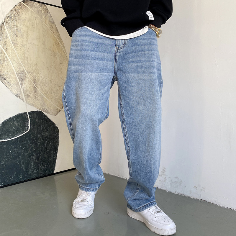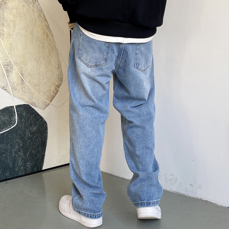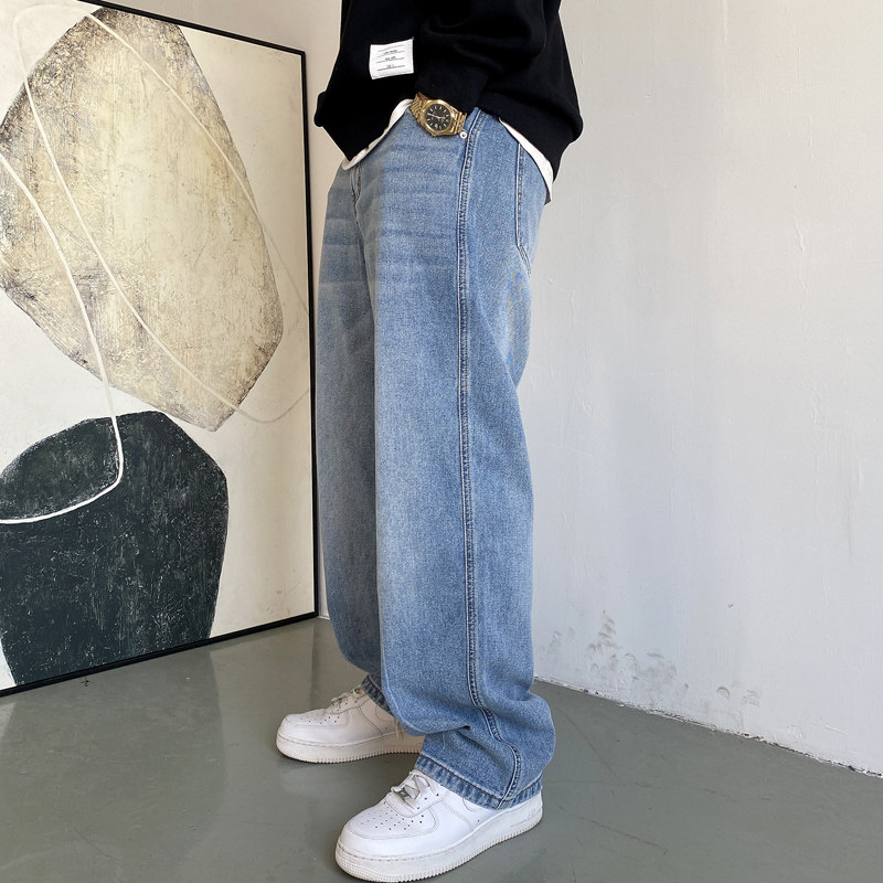 春夏季美式休闲痞帅复古浅蓝色牛仔裤男直筒宽松大码阔腿裤子薄款