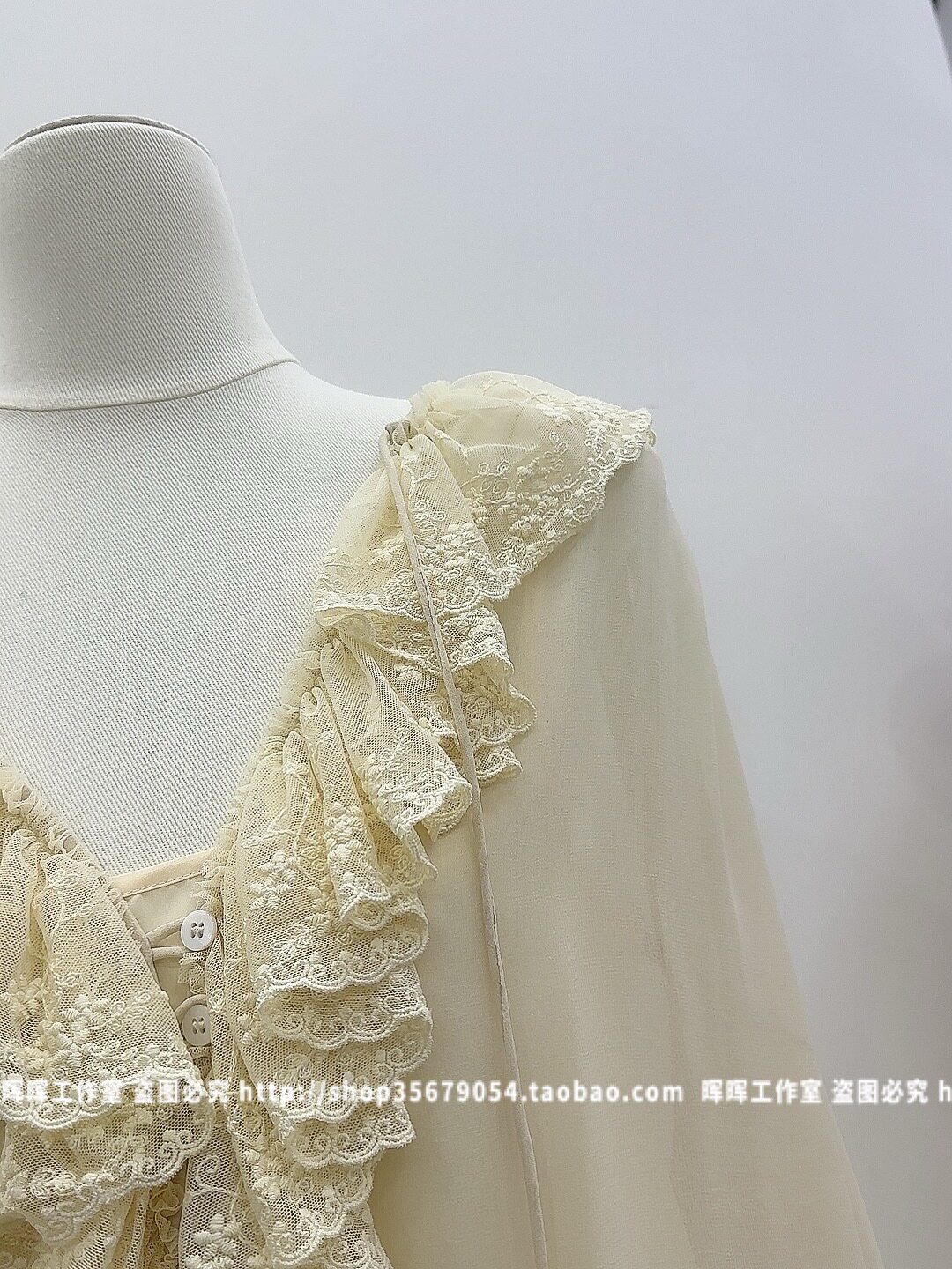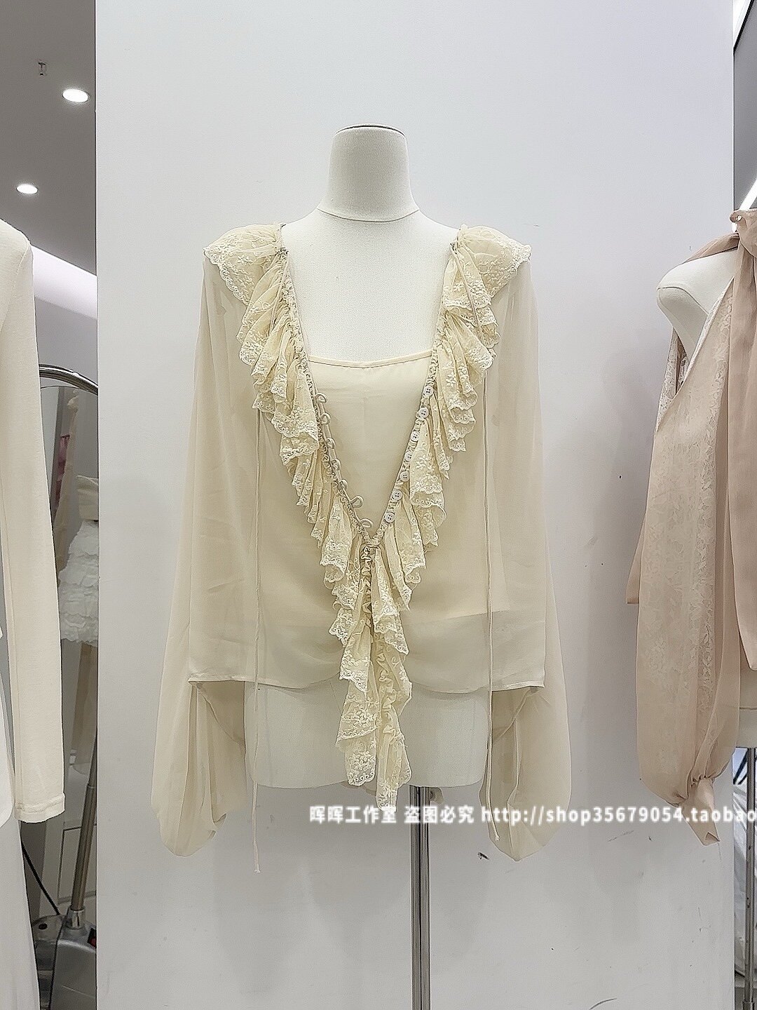 2026新款春装法式气质精致线微光v领花边绑带雪纺衬衫性感小衫女