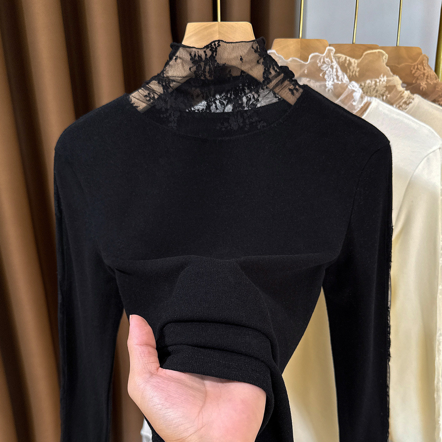 高级感高领磨毛蕾丝打底衫女秋冬新款加厚保暖牙签绒叠穿内搭小衫