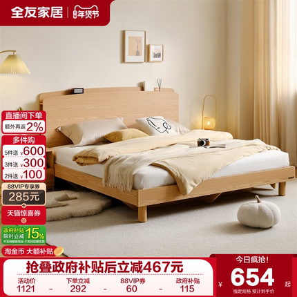 全友家居2025新款原木风板式床1米8双人床卧室储物1米5单人悬浮床