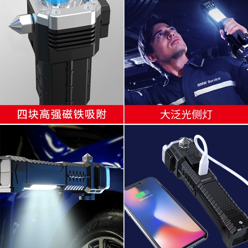 新款车载安全锤带侧灯COB救生USB充电多功能强光超亮手电筒破窗锤