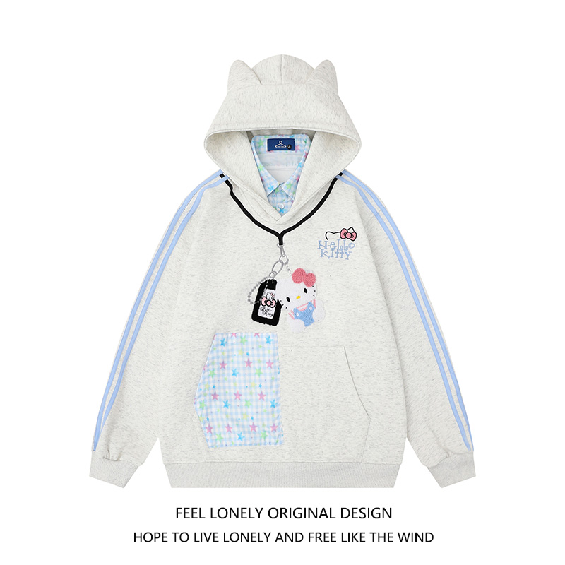 Feel lonely挂饰Kitty猫刺绣假两件猫耳连帽卫衣女宽松慵懒风上衣