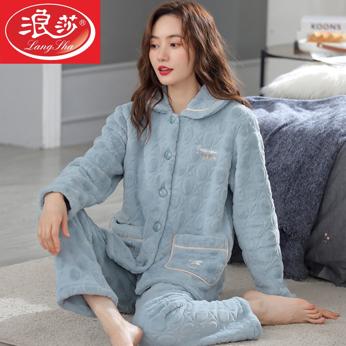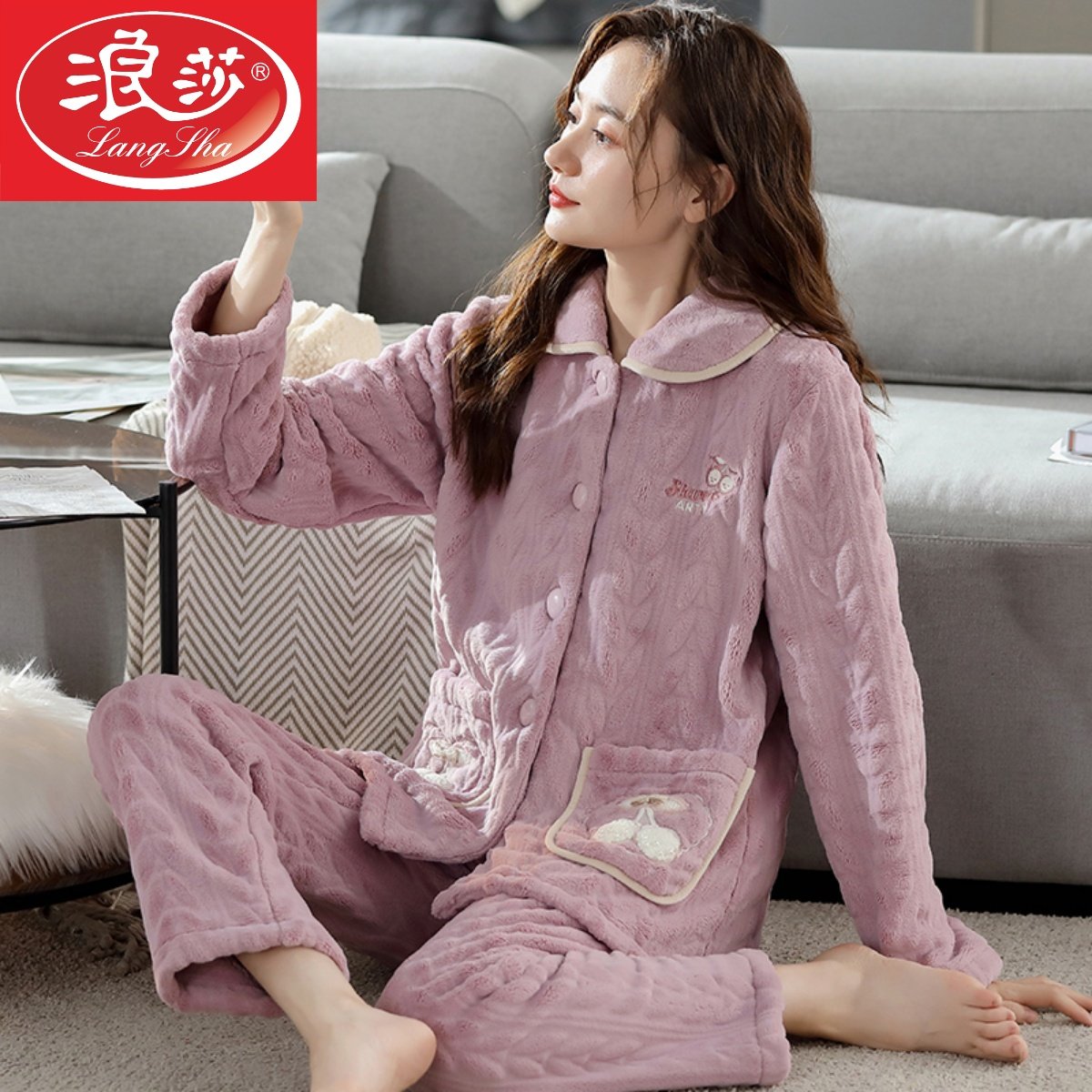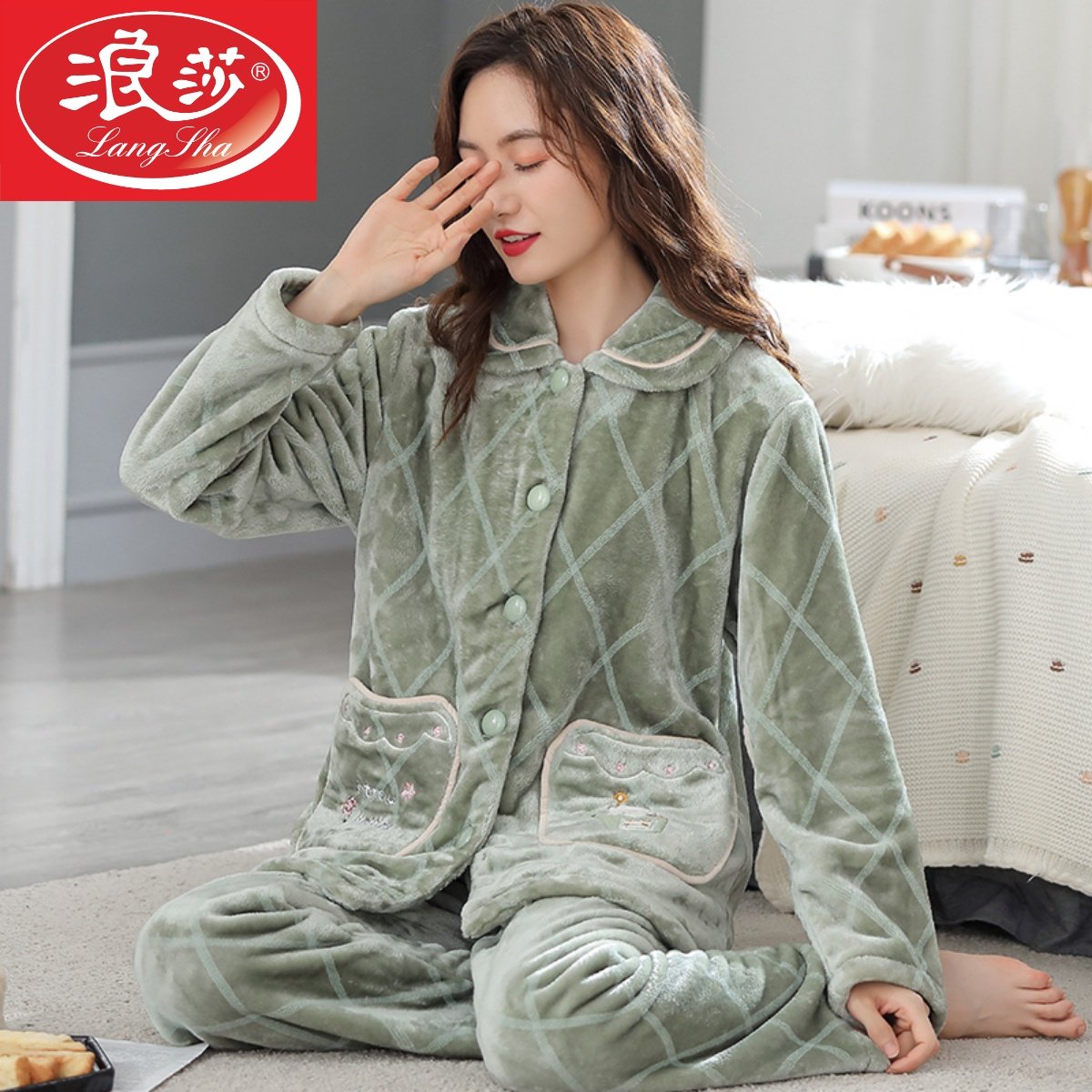 浪莎珊瑚绒睡衣女中年妈妈秋冬季加厚加绒老人法兰绒家居服套装冬