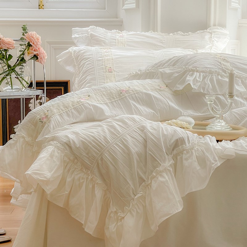 韩式全棉水洗g棉四件套花卉荷叶边花朵被套纯棉公主风1.8m床上用