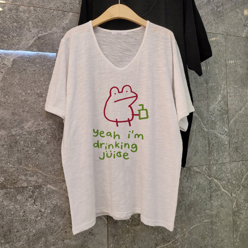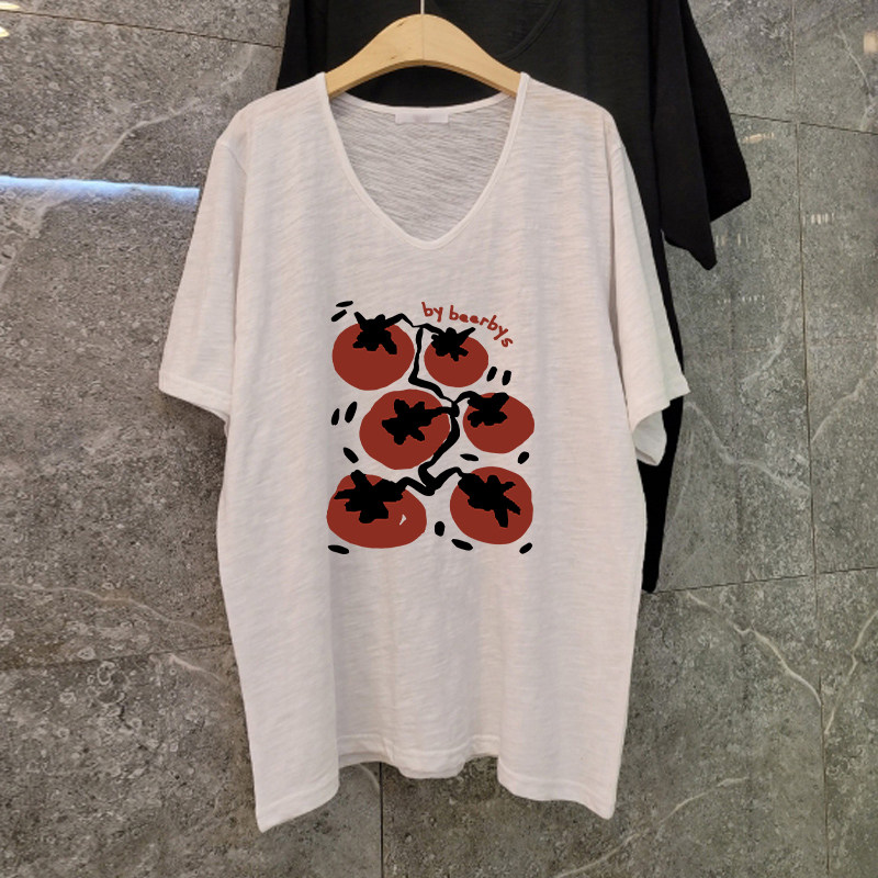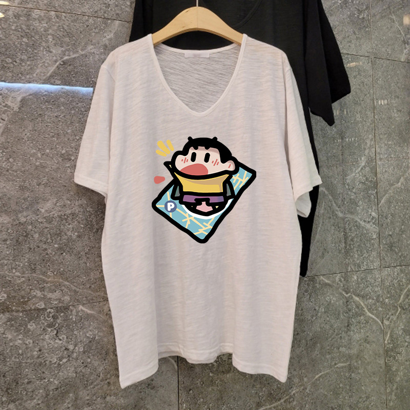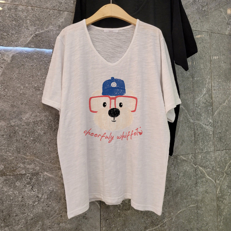 短袖白t恤女2025新款夏季大码女装宽松慵懒风竹节棉大领口v领上衣