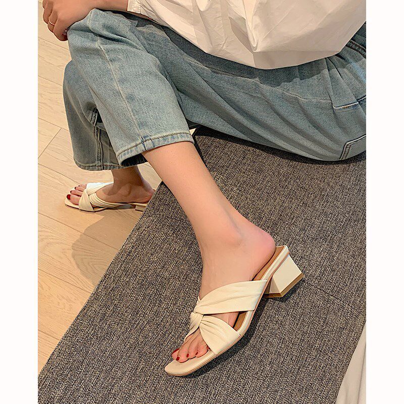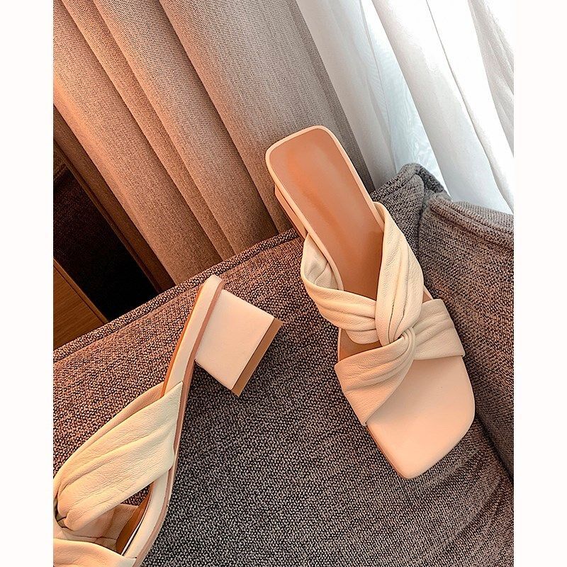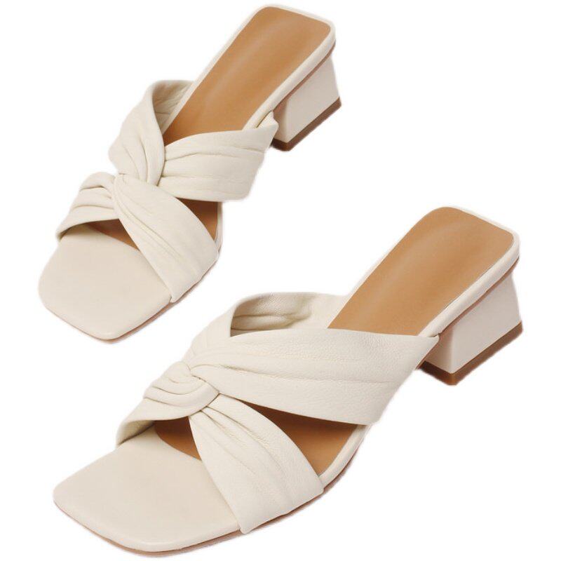 羊皮!巨软!2026夏季新款交叉带蝴蝶结粗跟凉拖鞋女外穿半拖凉鞋