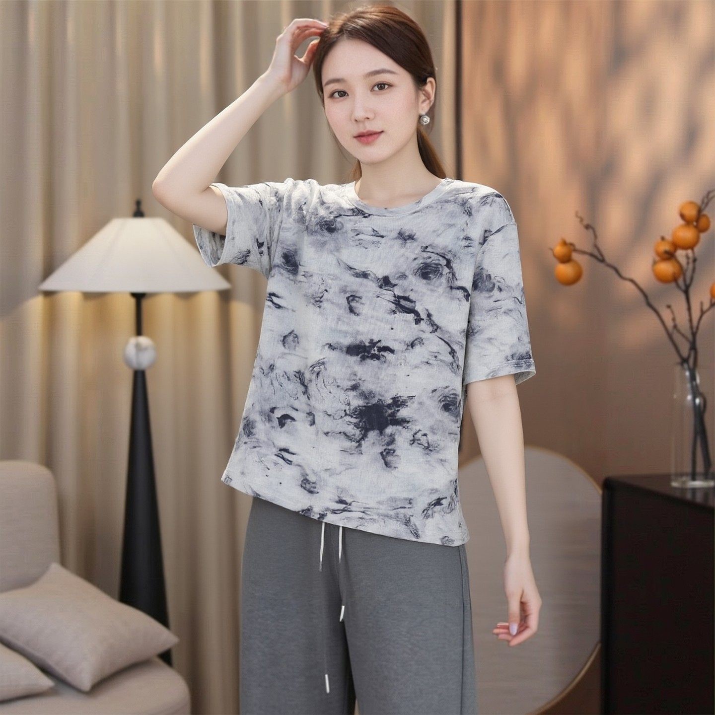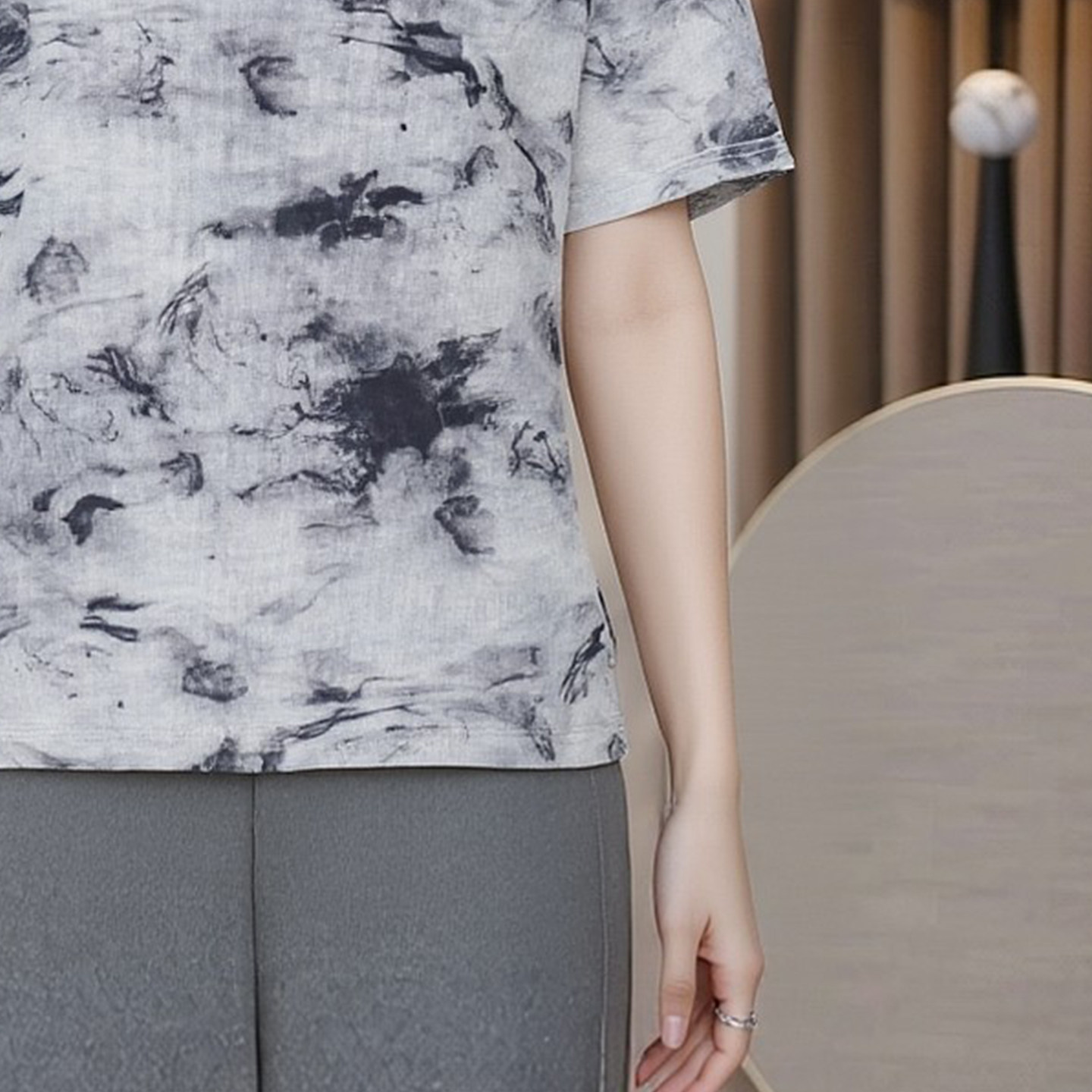 200斤t恤夏季妈妈轻薄上衣大码胖mm冰丝网纱国风水墨扎染短袖t恤