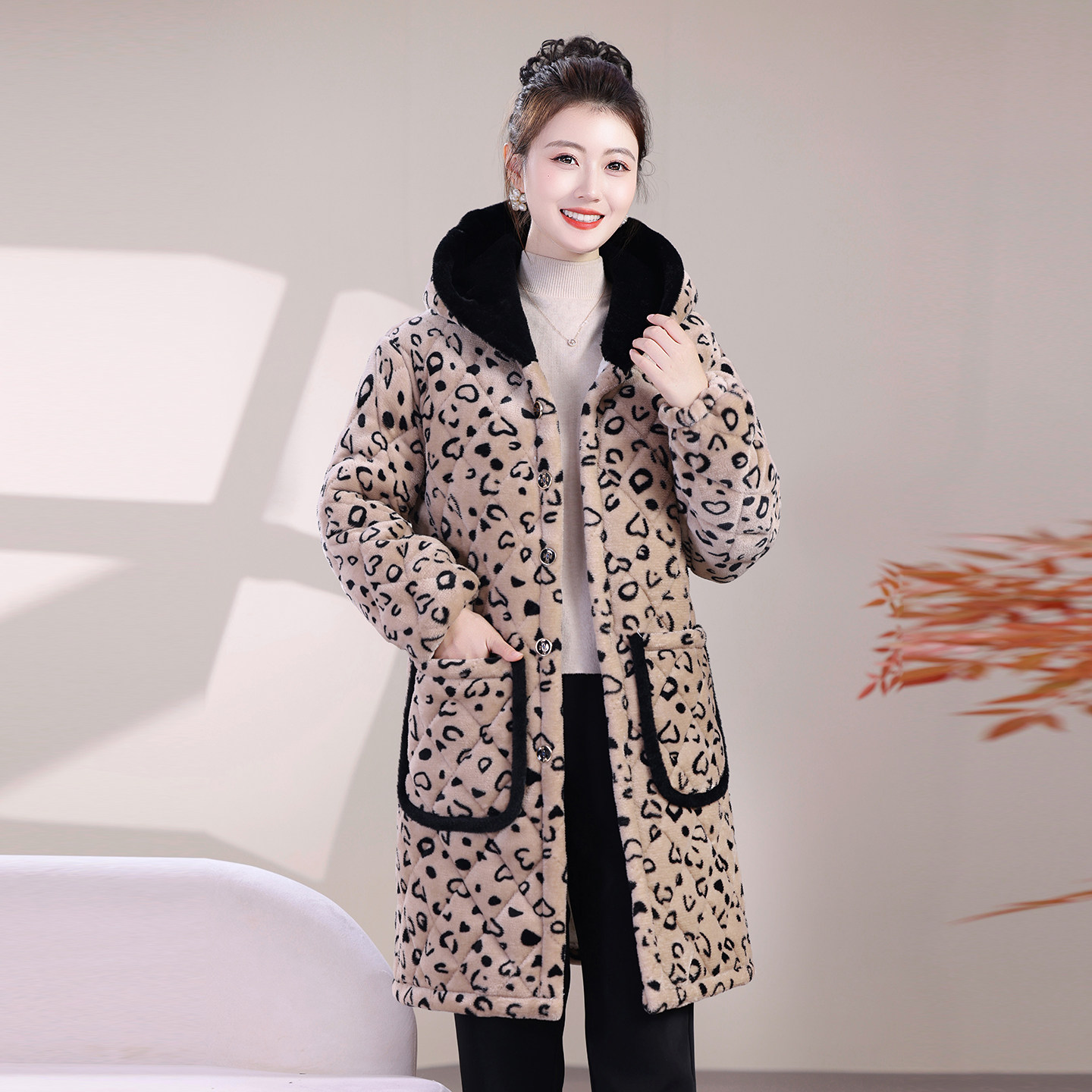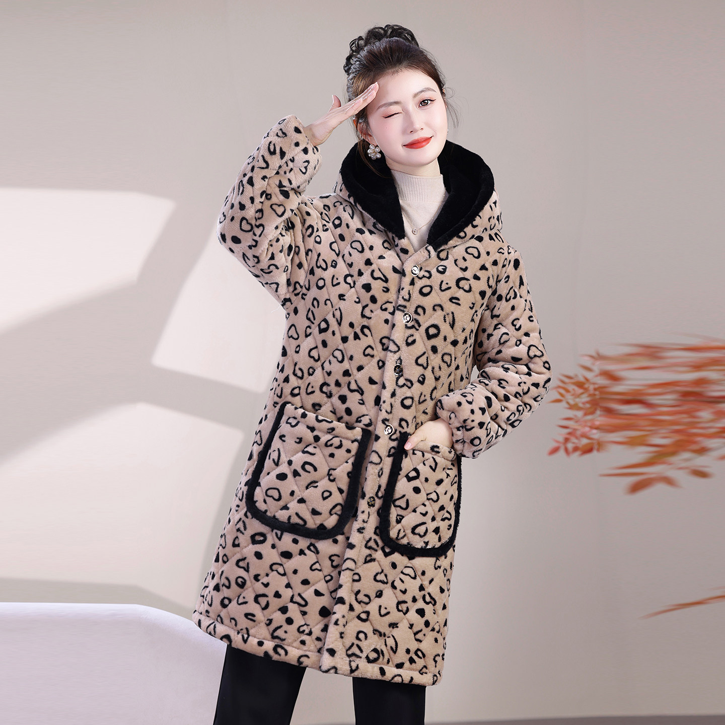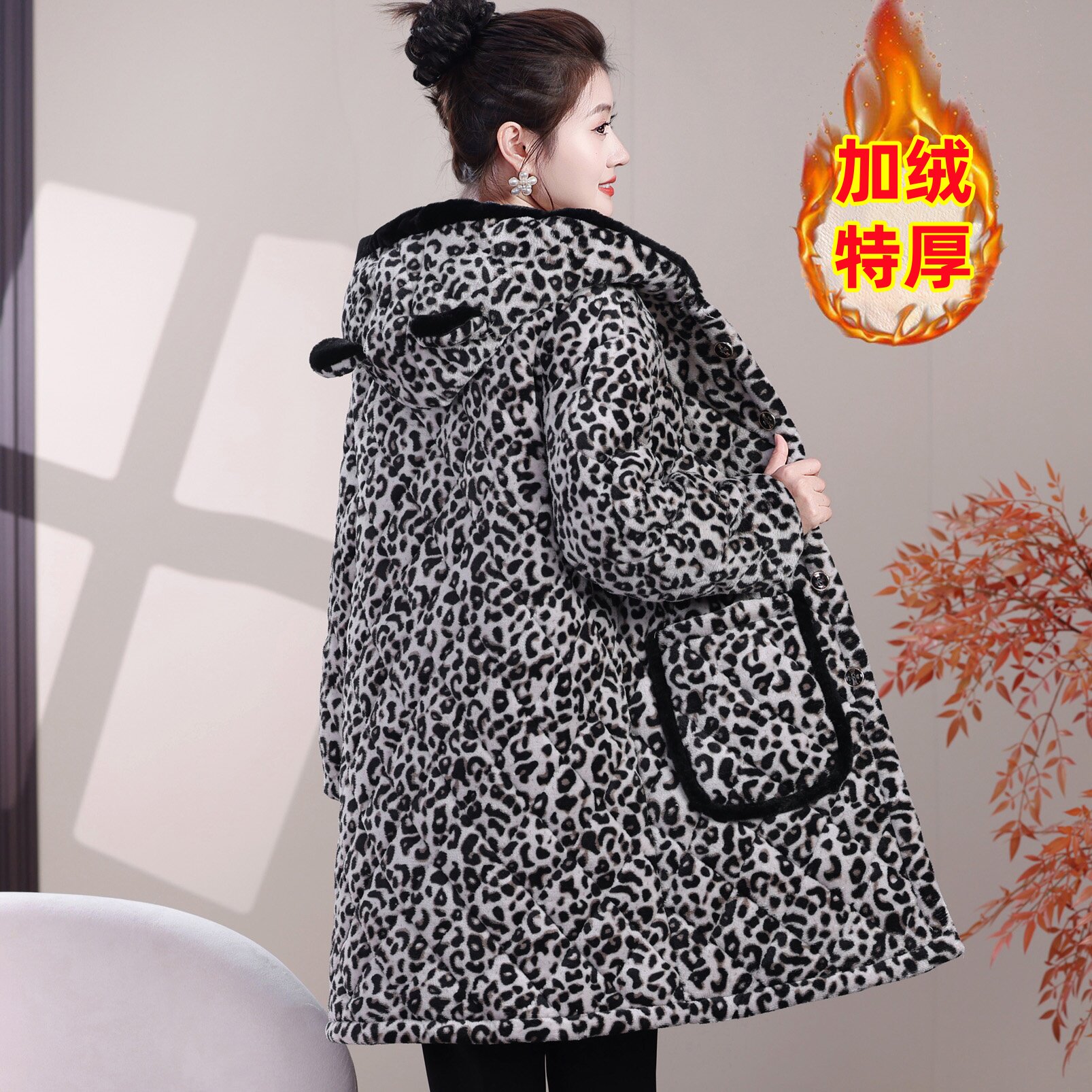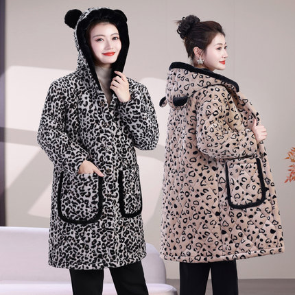 特厚加绒中长款豹纹棉袄外套女连帽加厚妈妈装冬季洋气睡衣家居服
