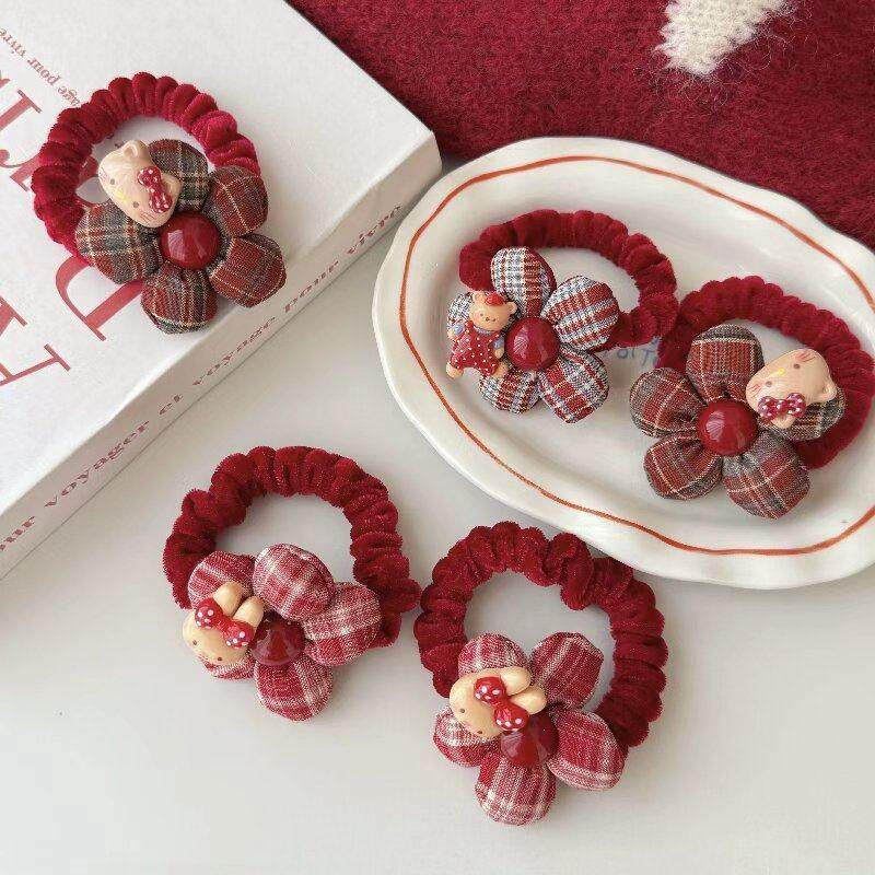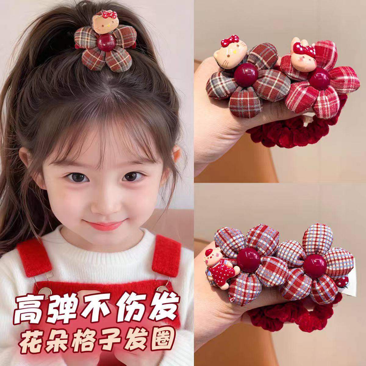 红色格纹花朵发圈儿童秋冬植绒扎发绳可爱卡通丸子头皮筋女童发饰
