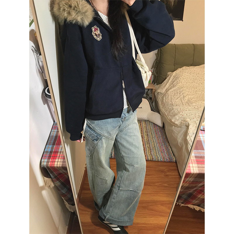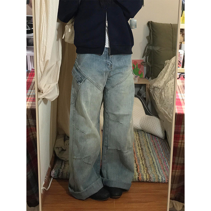 大码高个子折痕竹节纹磨白高腰牛仔裤女2025秋季新款宽松阔腿长裤