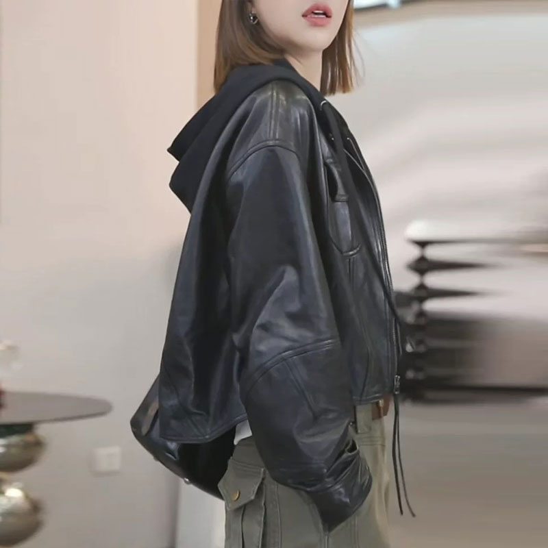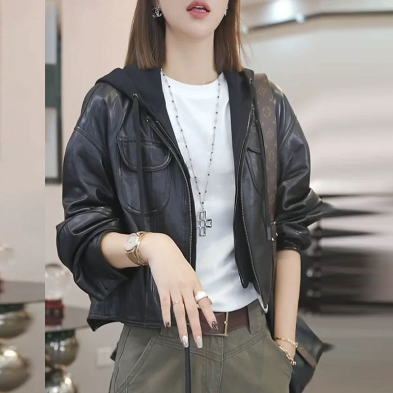 高级感黑色连帽假两件皮衣外套女秋季大码显瘦短款夹克洋气上衣潮