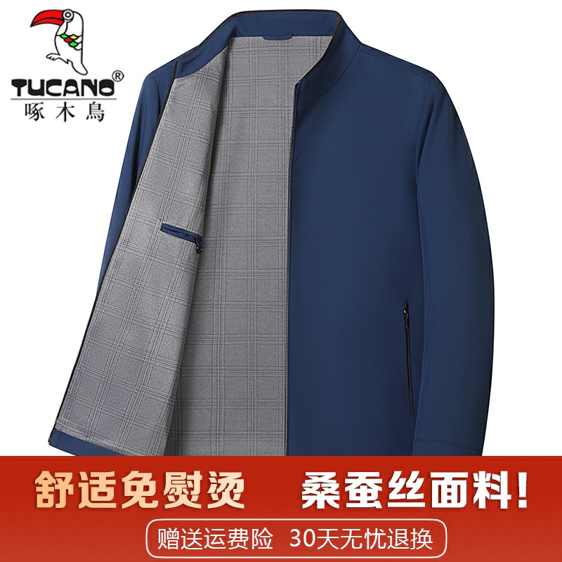 啄木鸟中老年男士立领春季薄外套商务休闲夹克桑蚕丝春秋短款爸爸