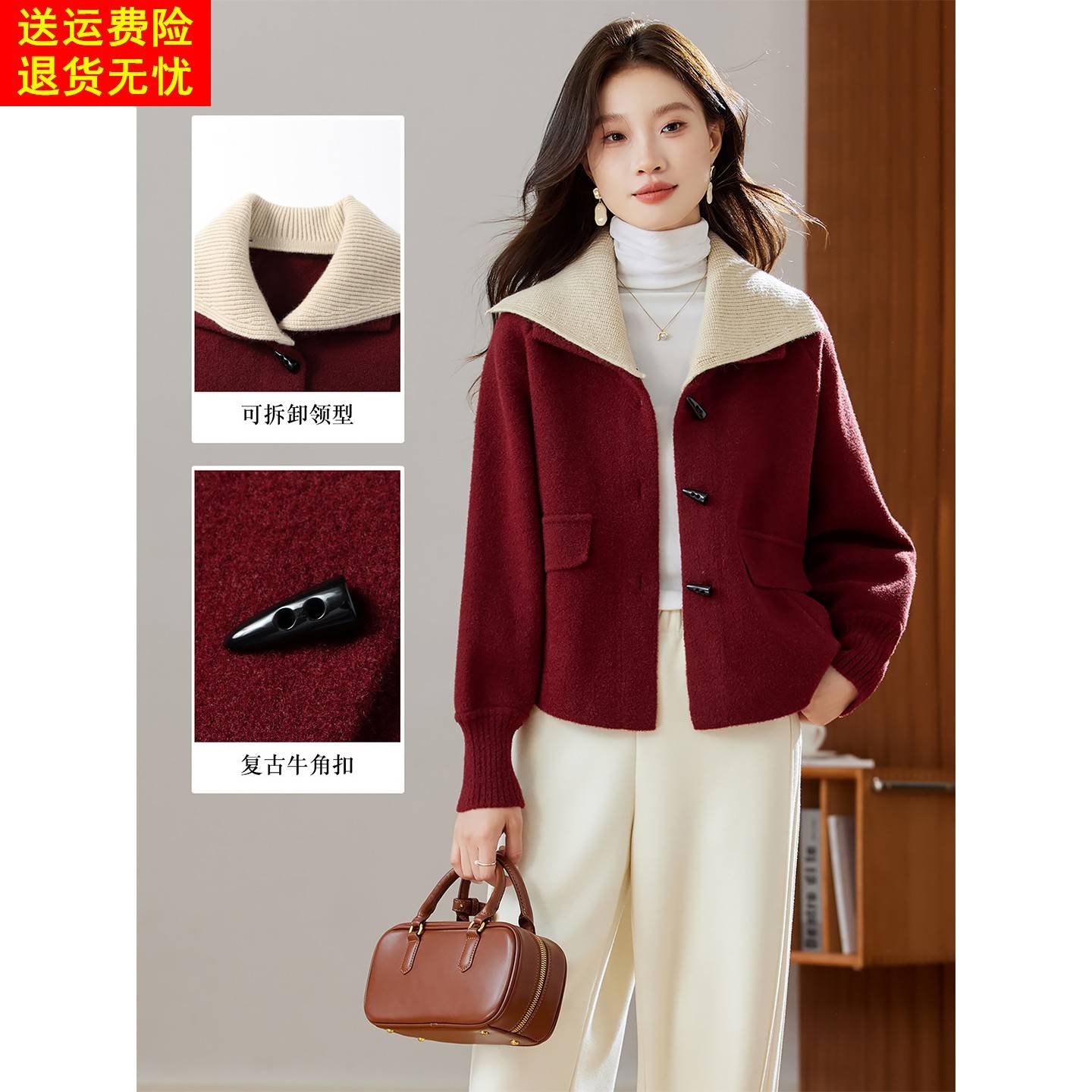 复古红色短款毛呢外套女秋冬2025新款洋气翻领加厚牛角扣开衫上衣