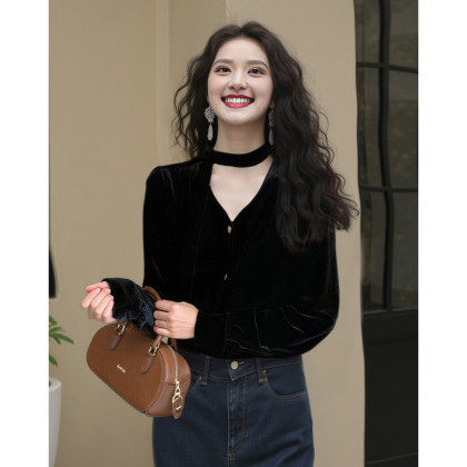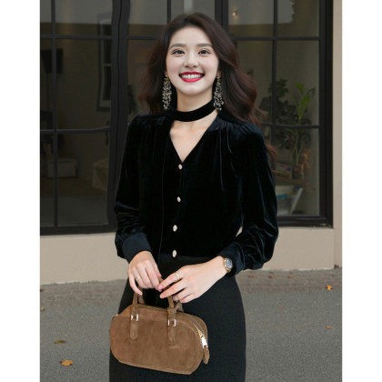 气质女人味飘带丝绒衬衫女26年新款时尚高级感百搭V领开衫上衣