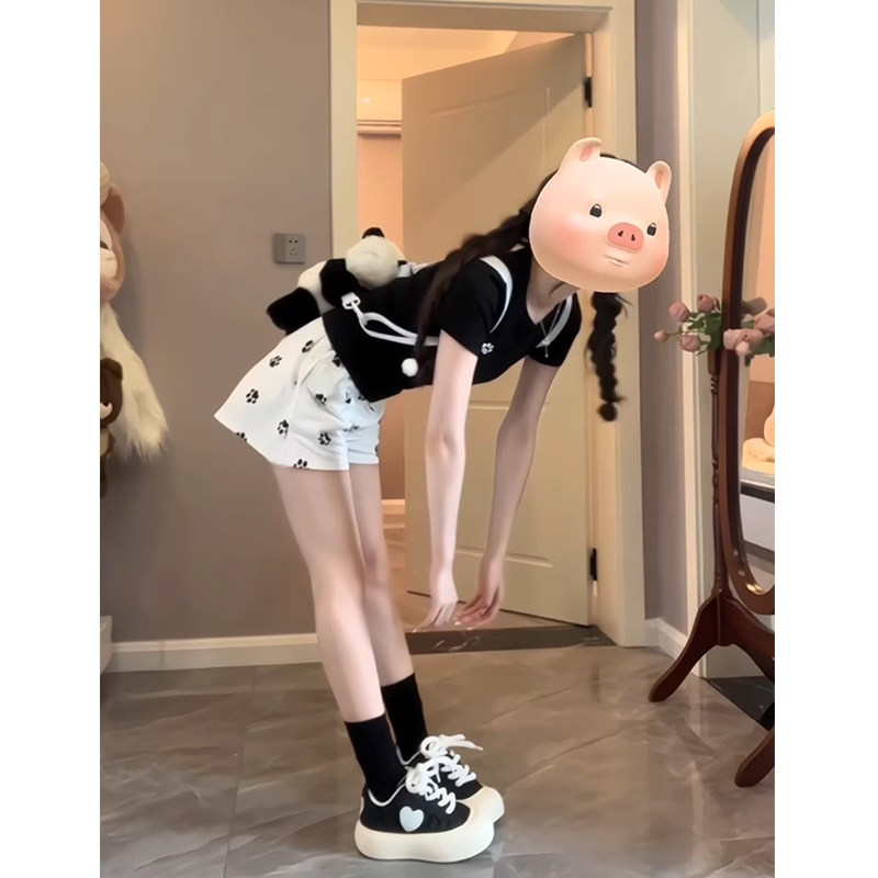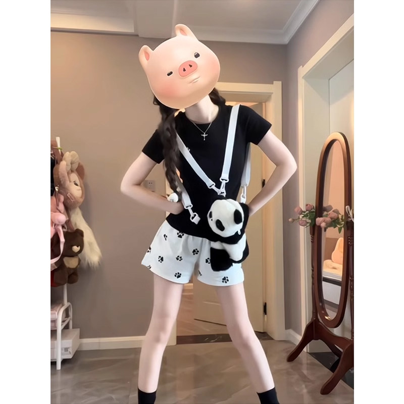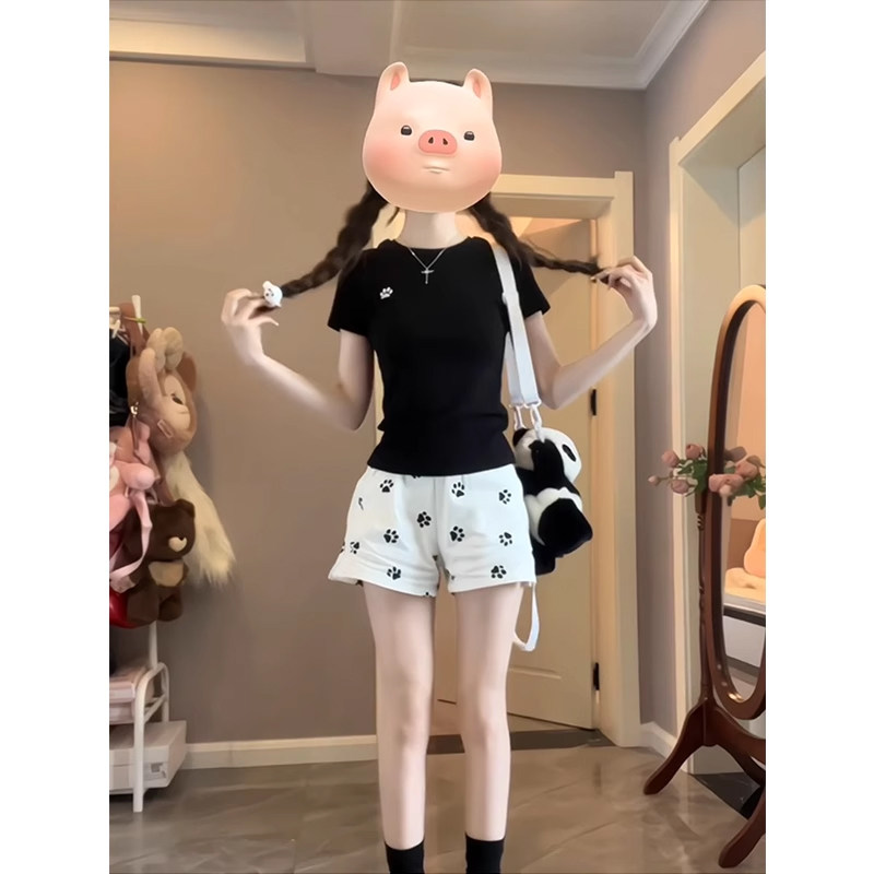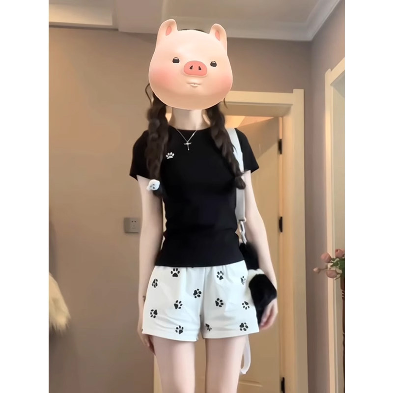 白色可爱狗爪印花运动短裤女夏季小个子2024新款休闲宽松阔腿热裤