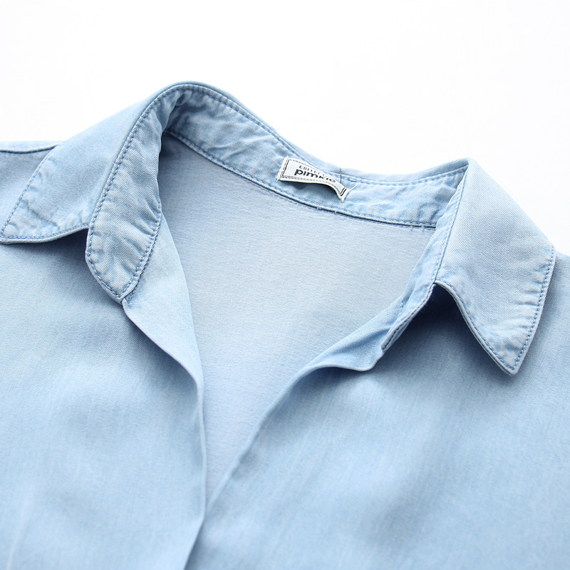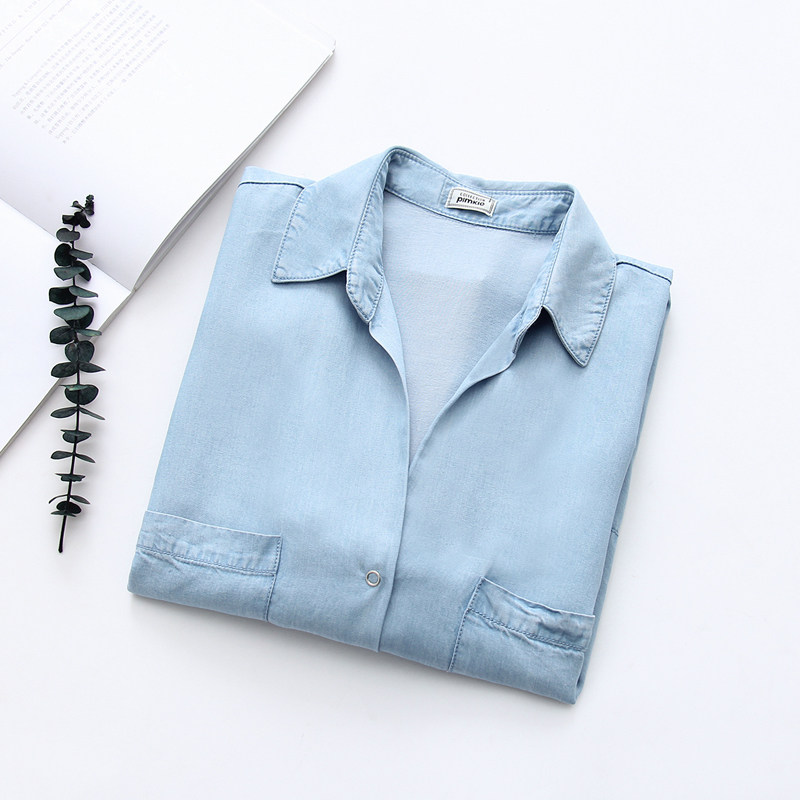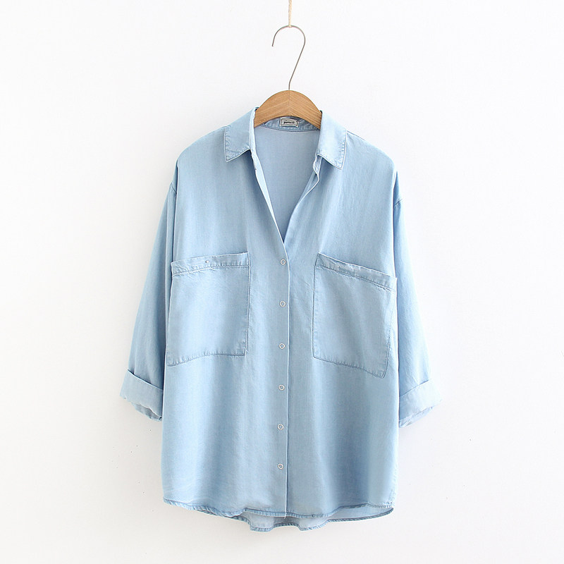 夏季新款天丝牛仔衬衫女欧美宽松中袖双口袋百搭大码五分袖衬衣女