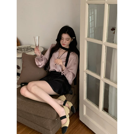 YIYIWANG缎面粉黑配色系带衬衫