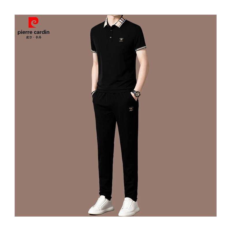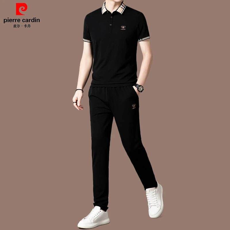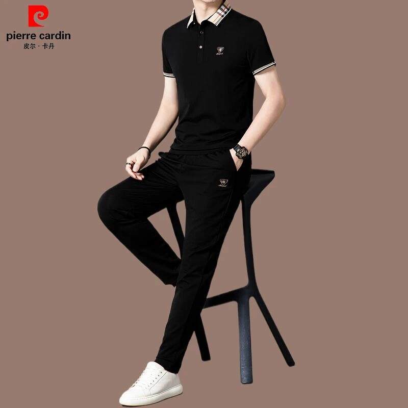 皮尔卡丹男士夏季桑蚕丝休闲套装薄款冰丝短袖POLO衫直筒裤两件套