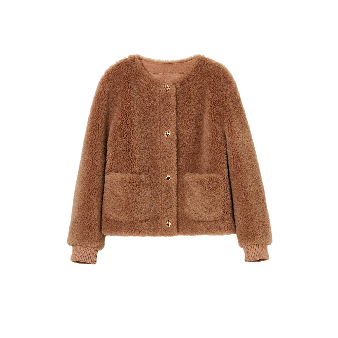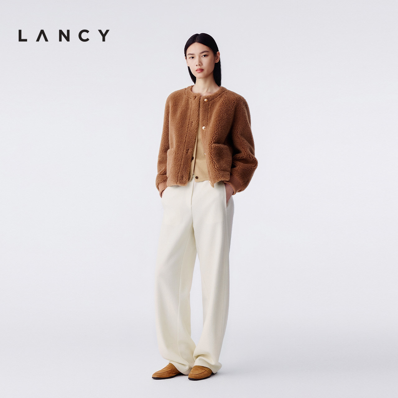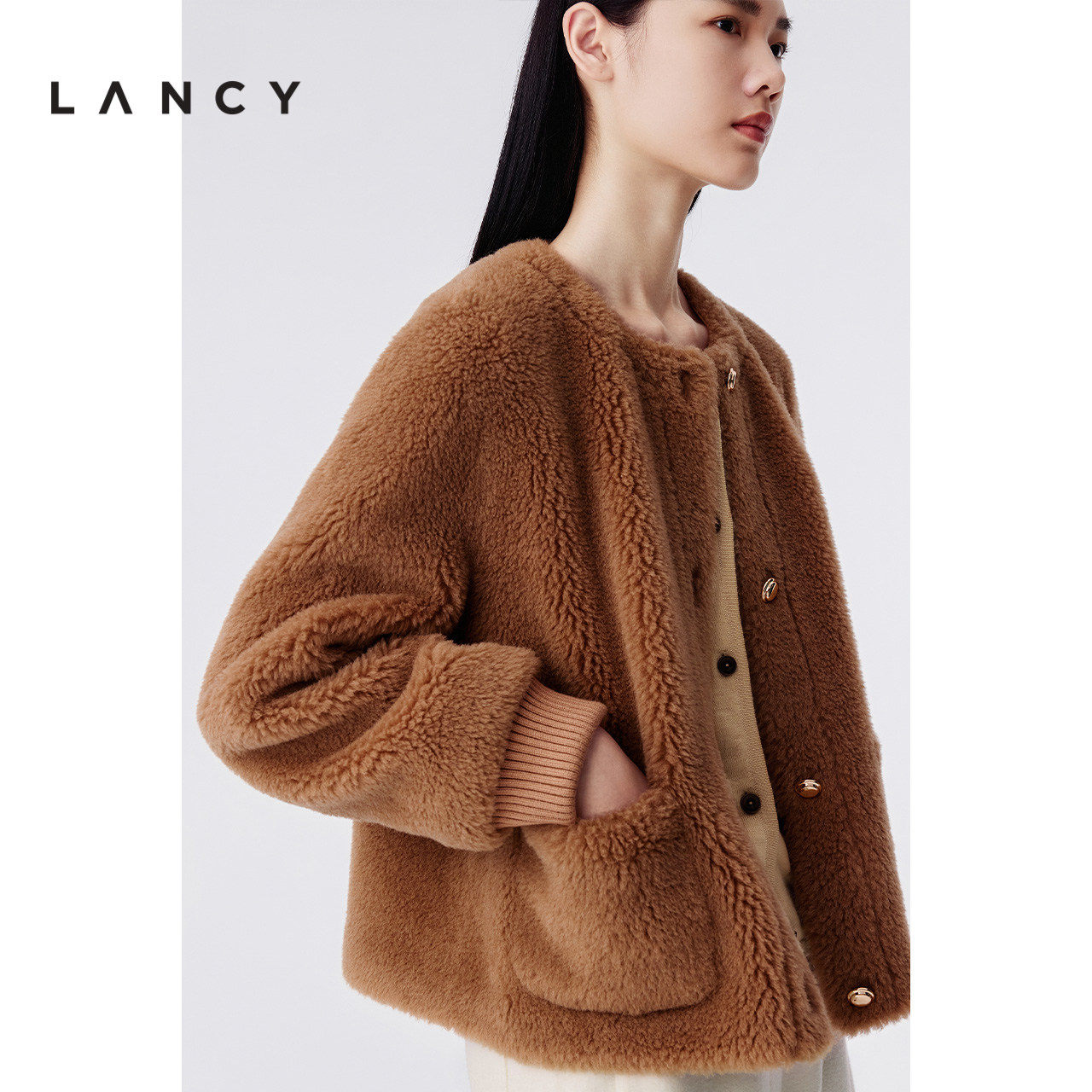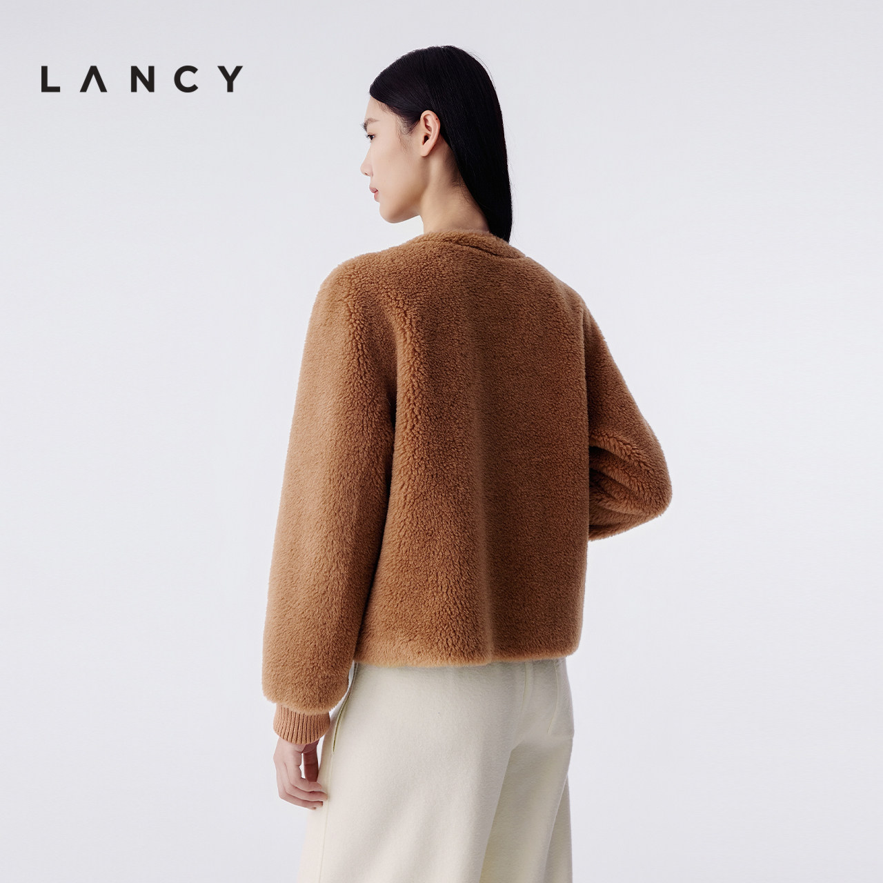 【羊毛驼毛】LANCY/朗姿2025冬季新款复古圆领优雅短款颗粒绒外套