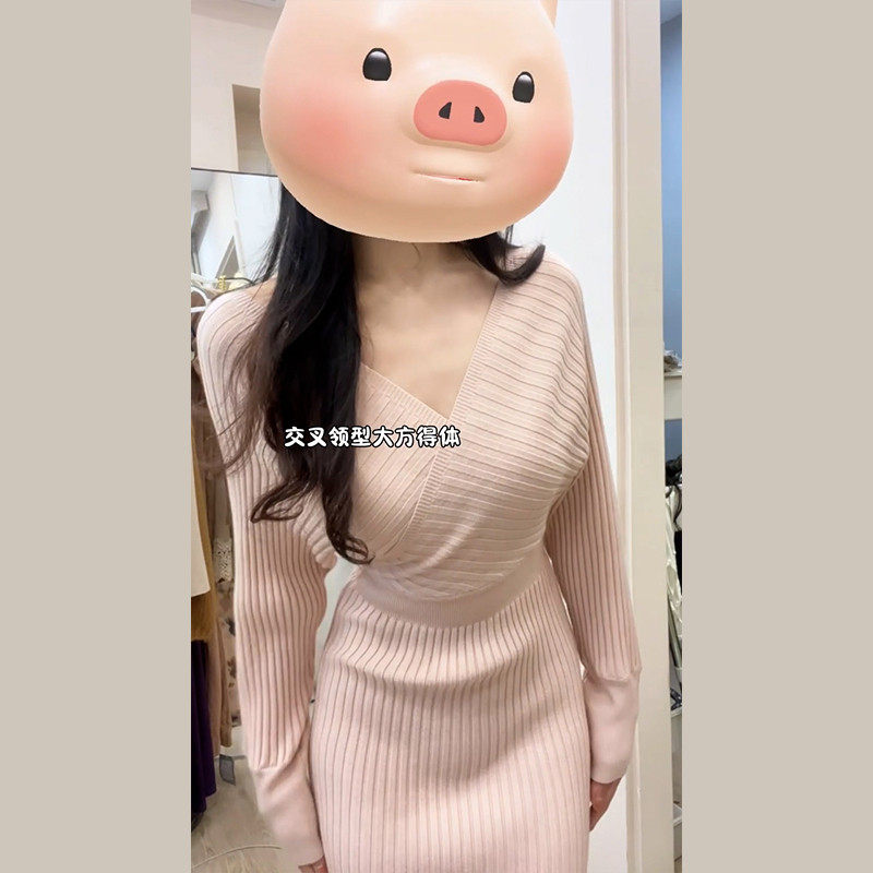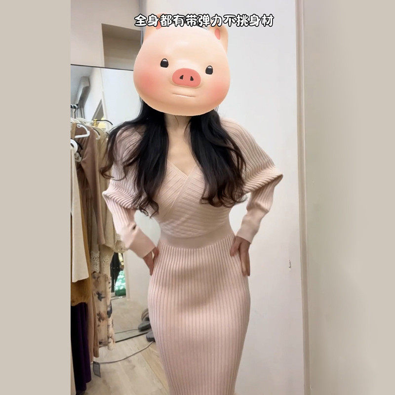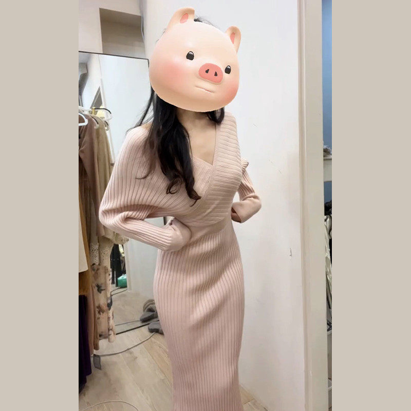 性感纯欲粉色v领针织连衣裙子女秋冬季2025新款修身收腰包臀长裙