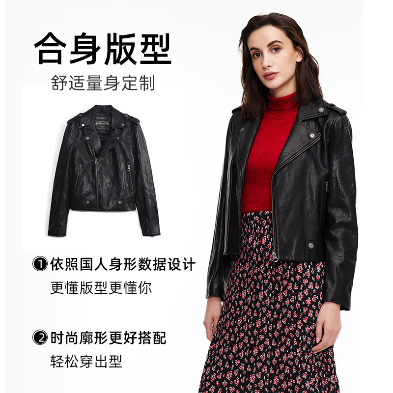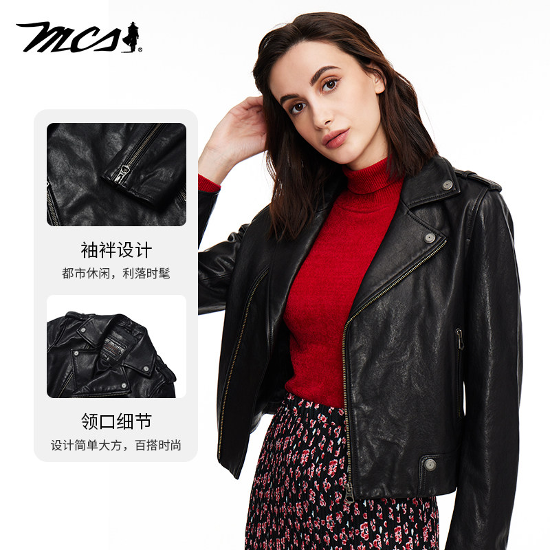 MCS女装源自万宝路秋款甜酷风合身翻领短款绵羊皮革真皮皮衣夹克