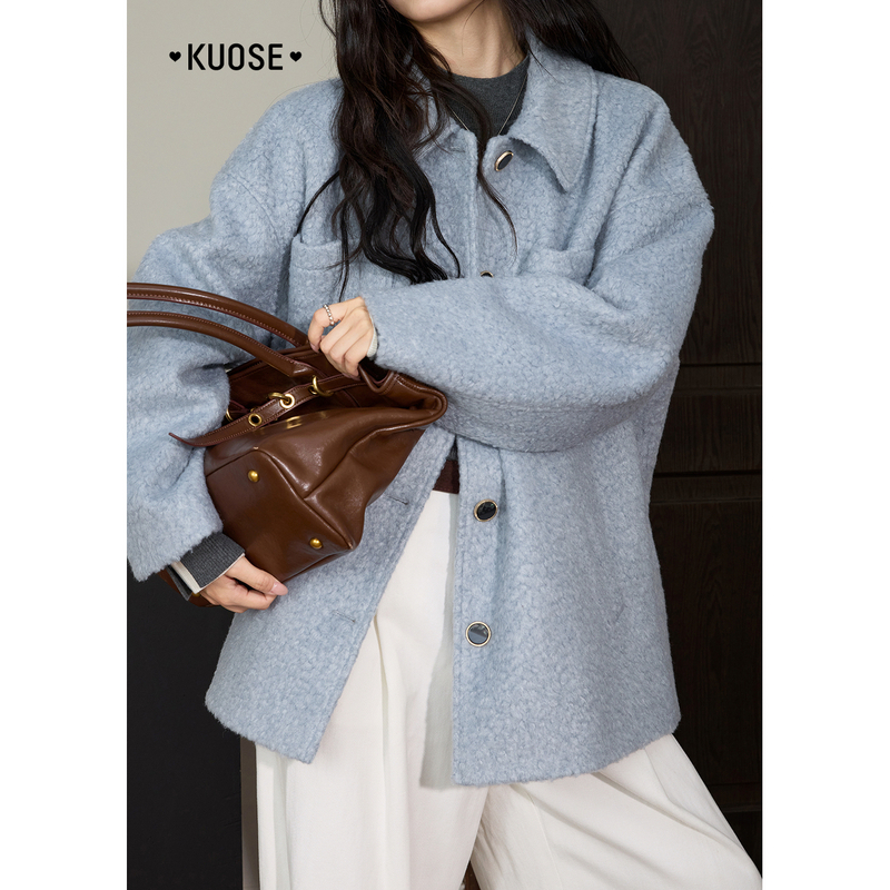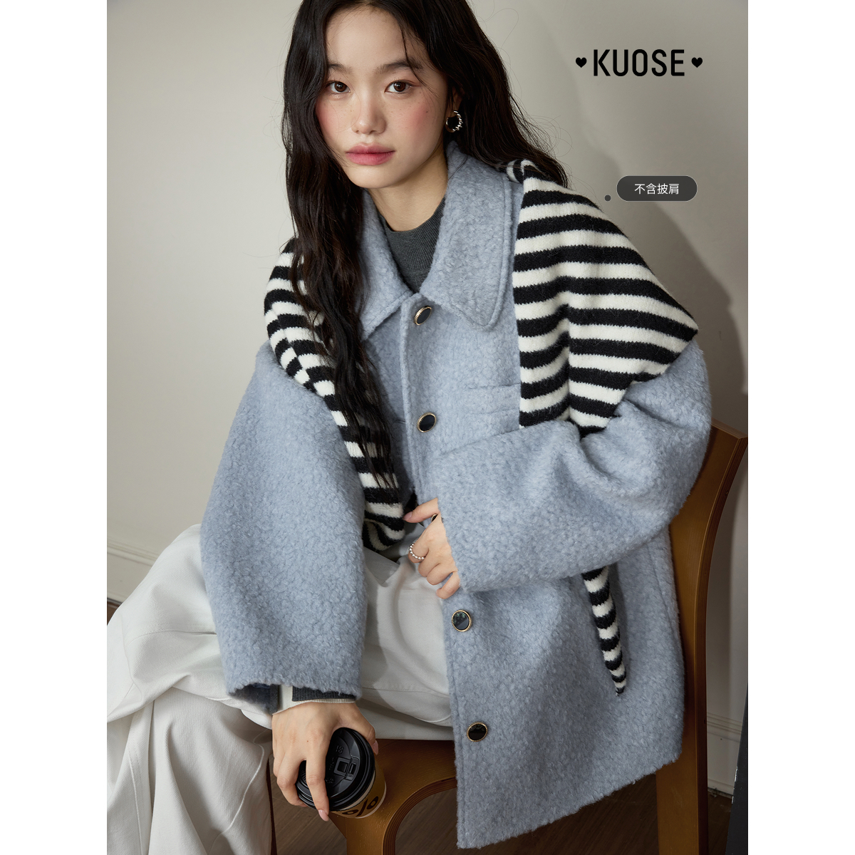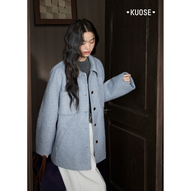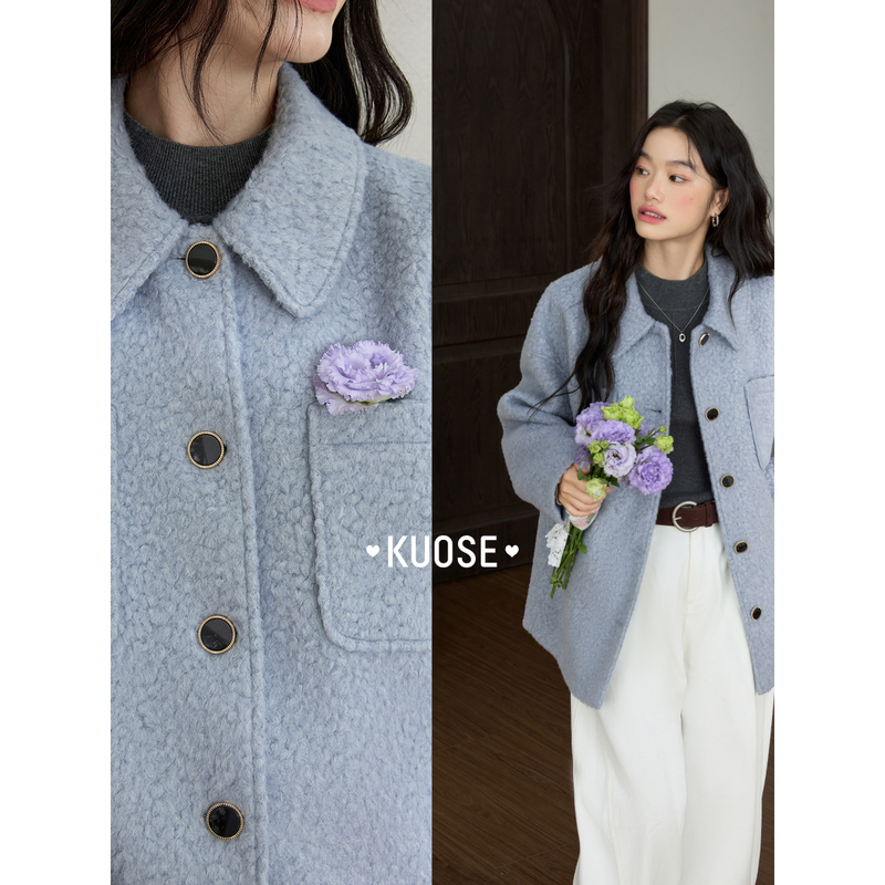 阔色小个子温柔系穿搭毛呢外套女2025秋冬季新款蓝色翻领呢子大衣