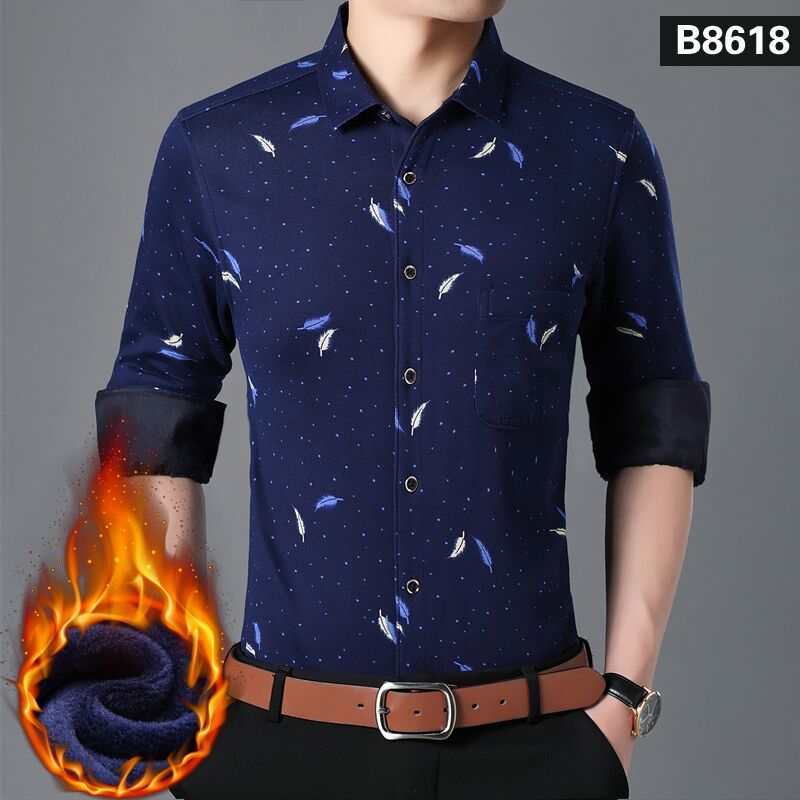 冬季中年爸爸装男式长袖加绒加厚保暖衬衫弹力一体绒休闲加绒衬衣