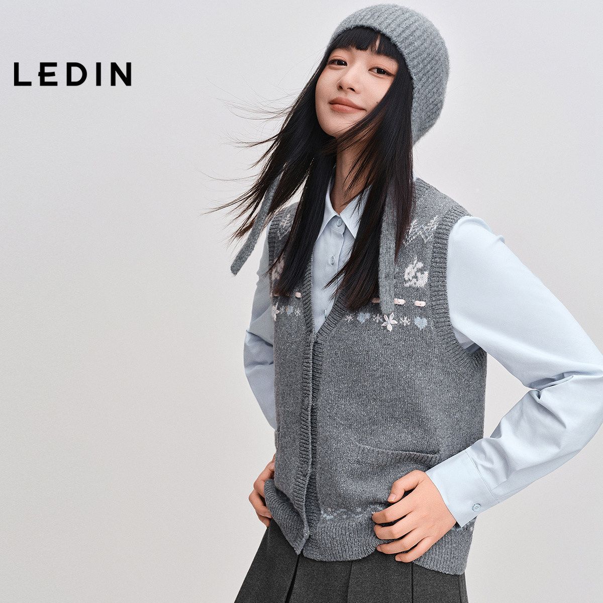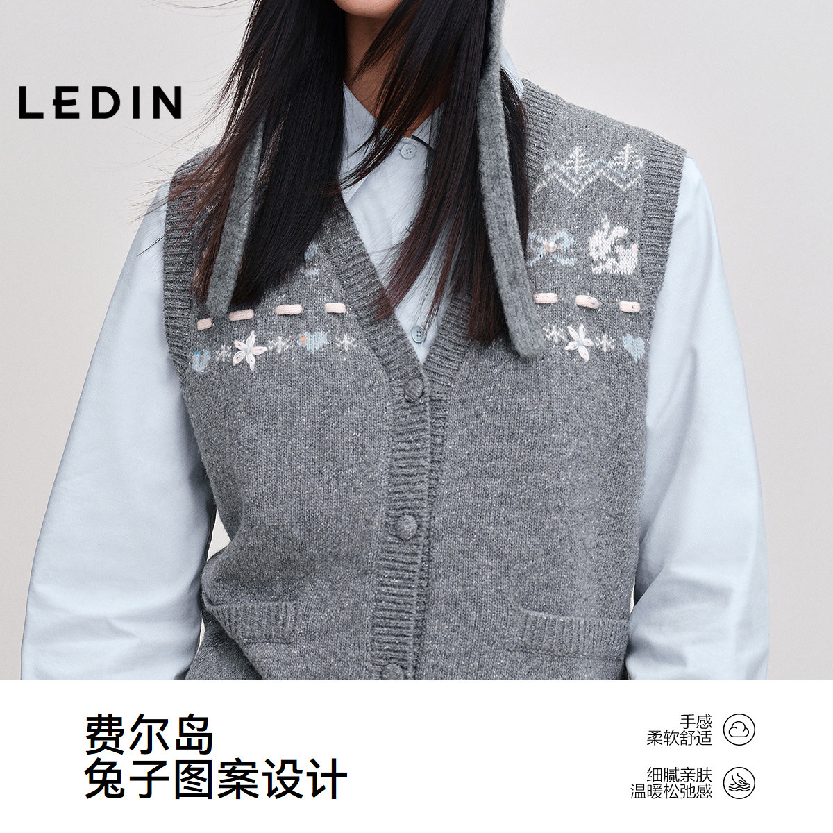 【费尔岛】乐町V领背心开衫女秋冬新款兔子提花外搭口袋毛针织衫