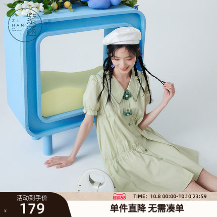 紫涵翻领A字连衣裙夏季新款泡泡袖撞色抽褶娃娃裙中长裙甜美休闲