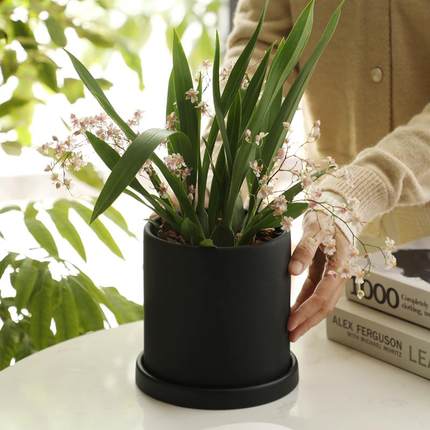 典雅黑色陶土盆花园庭院桌面简约素烧陶瓷花盆香松蝴蝶兰盆栽套盆