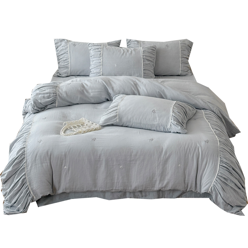 云柔漫步︱法式全棉刺绣双层纱四件套纯棉柔软纱布褶皱边被套床品