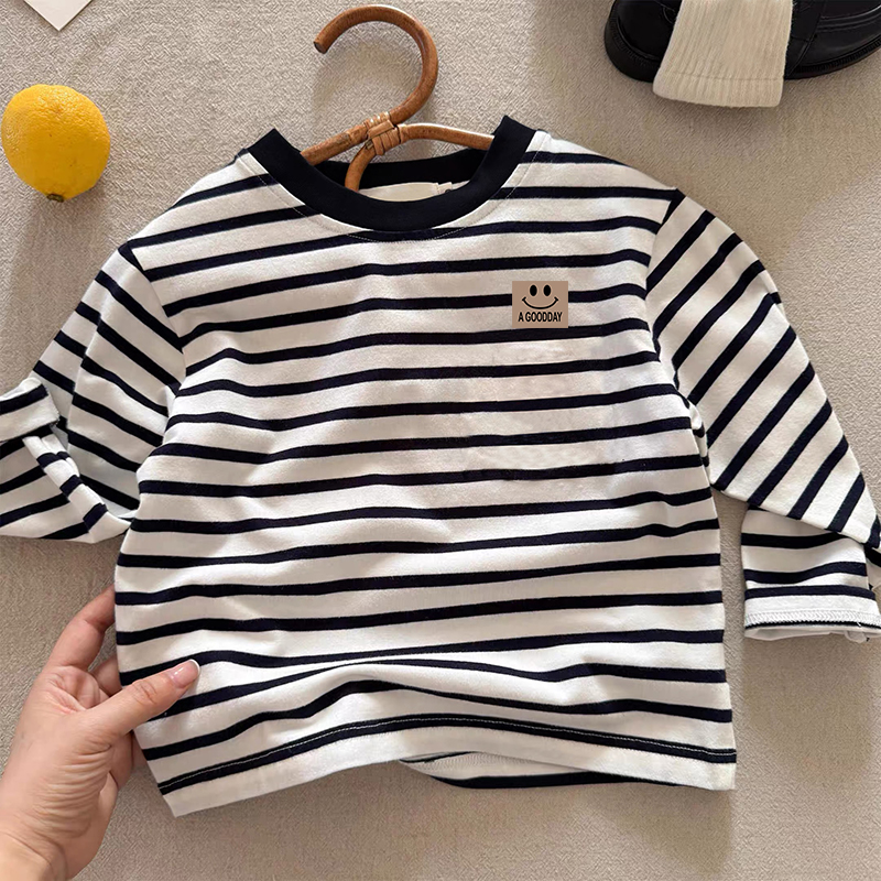春秋新款男女童卡通趣味印花长袖条纹T恤休闲可爱薄款纯棉打底衫