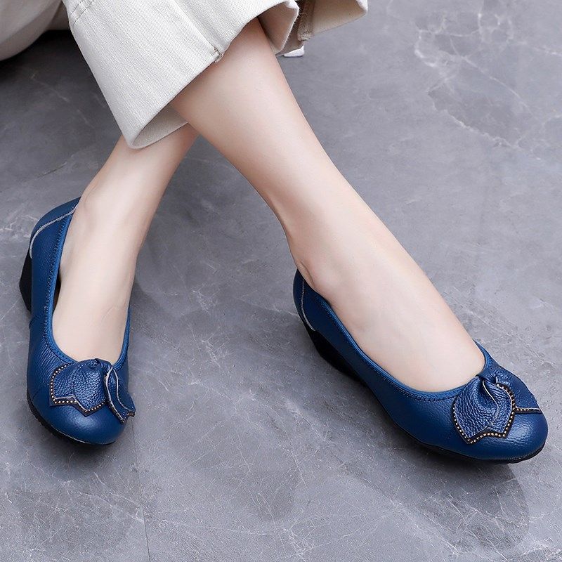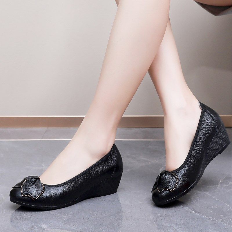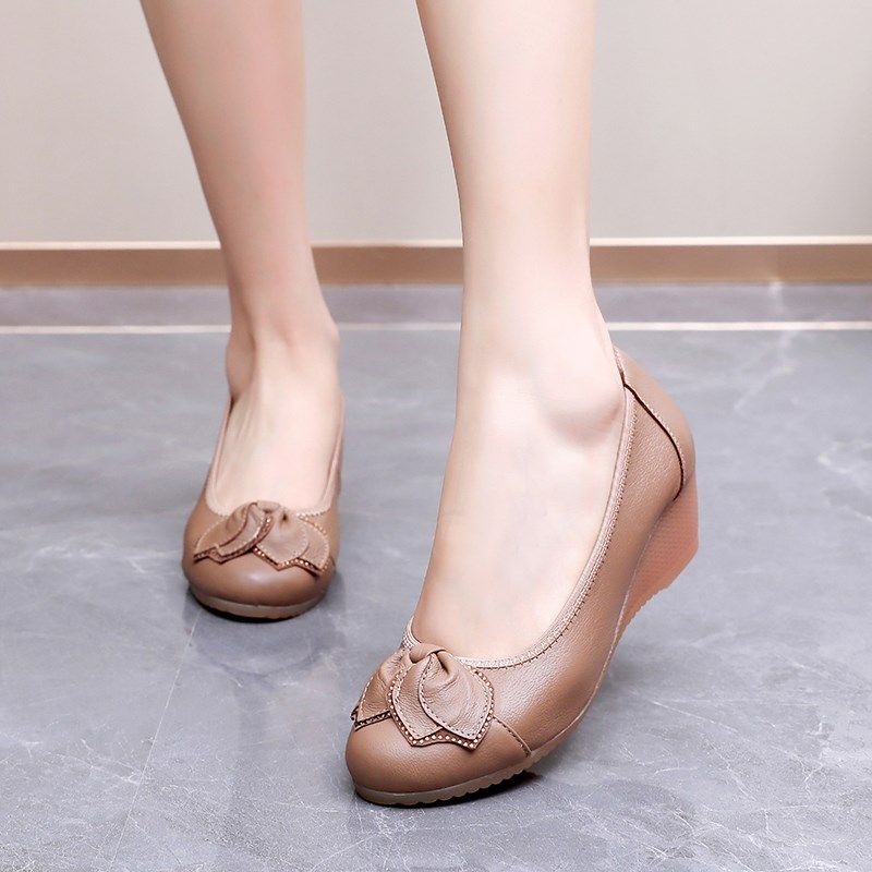 新款时尚妈妈鞋春秋坡跟真皮单鞋女浅口不累脚皮鞋牛筋底中年女鞋