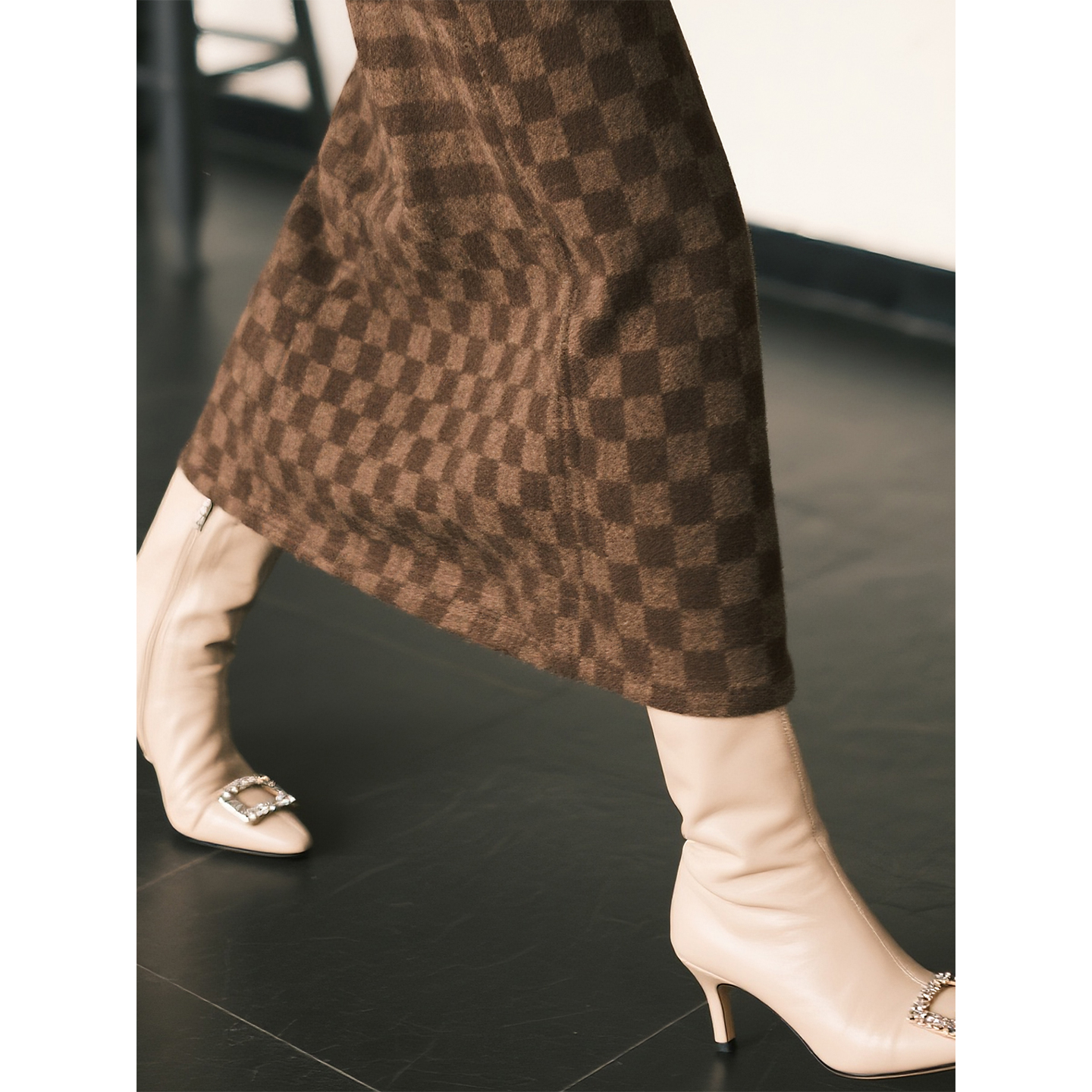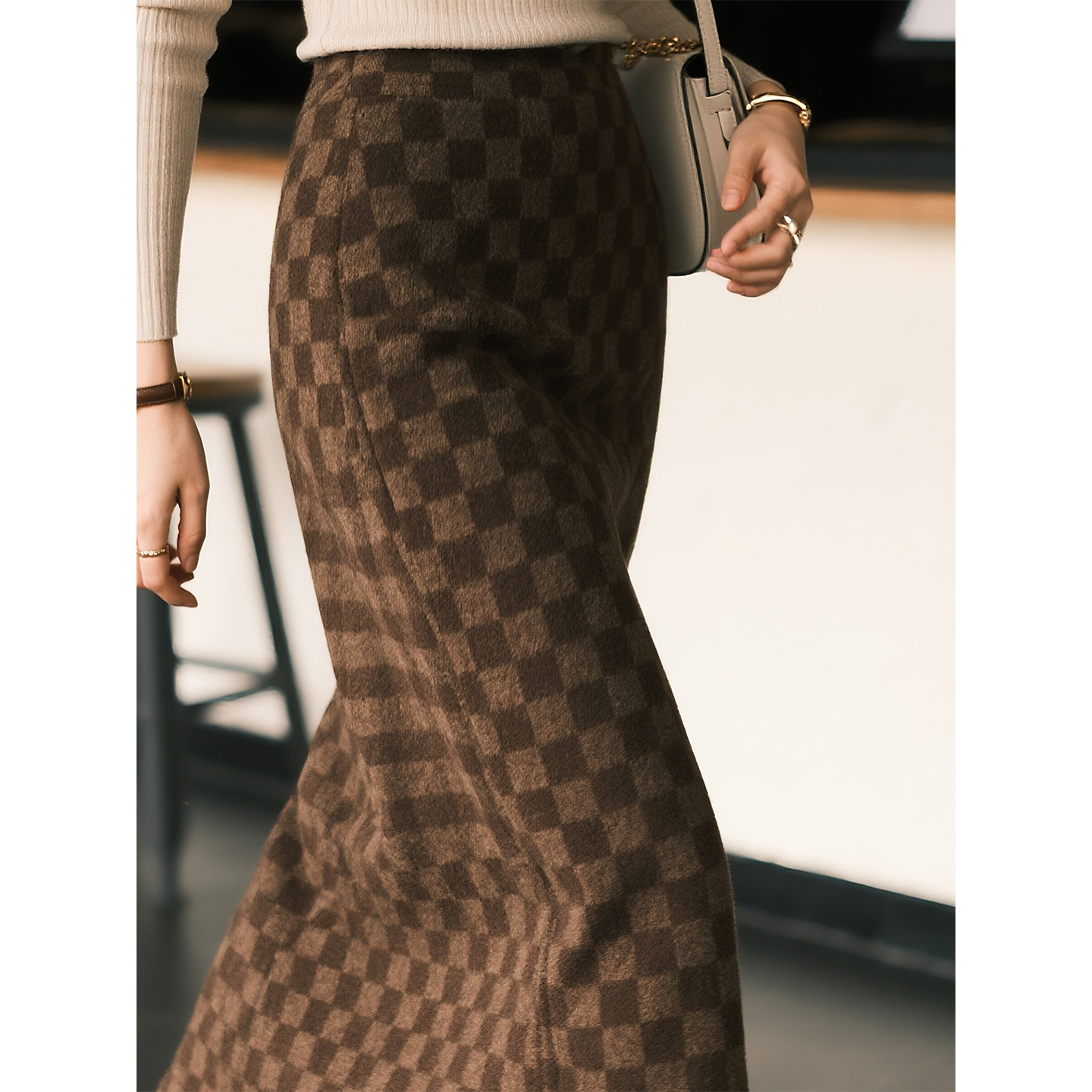棕色格子毛呢半身裙女2025年秋冬新款高腰显瘦中长裙直筒包臀裙