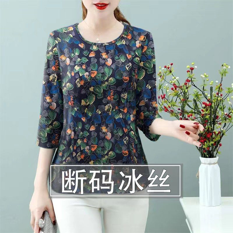 2025冰丝仿香云纱七分袖t恤女春秋新款妈妈碎花遮肚上衣打底衫潮