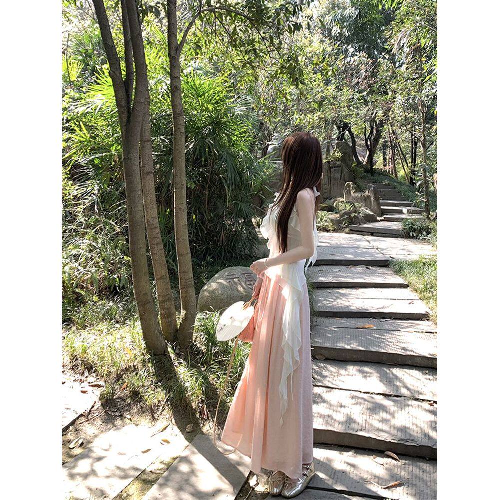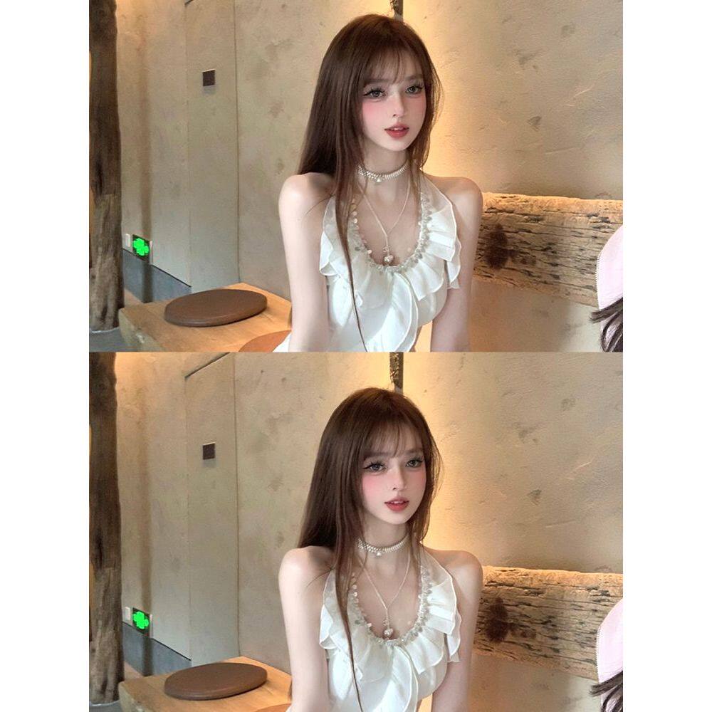 烟雨江南 细闪荷叶浪漫挂脖衫法式温柔小清新夏季套装女惊艳裙子