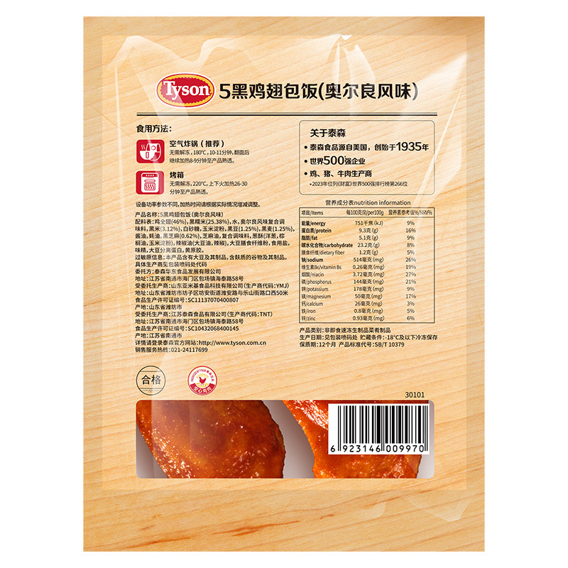Tyson/泰森5黑鸡翅包饭空气炸锅食材150g*6包奥尔良味烧烤小食