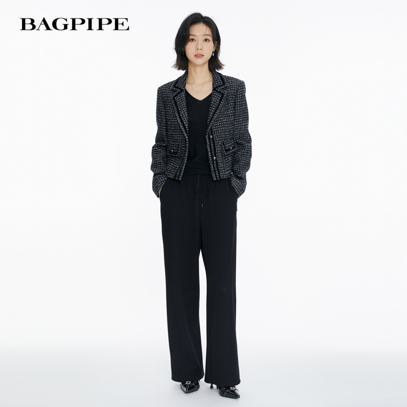 风笛2025春季新款格子粗花毛呢外套女西装领短款小香风外衣