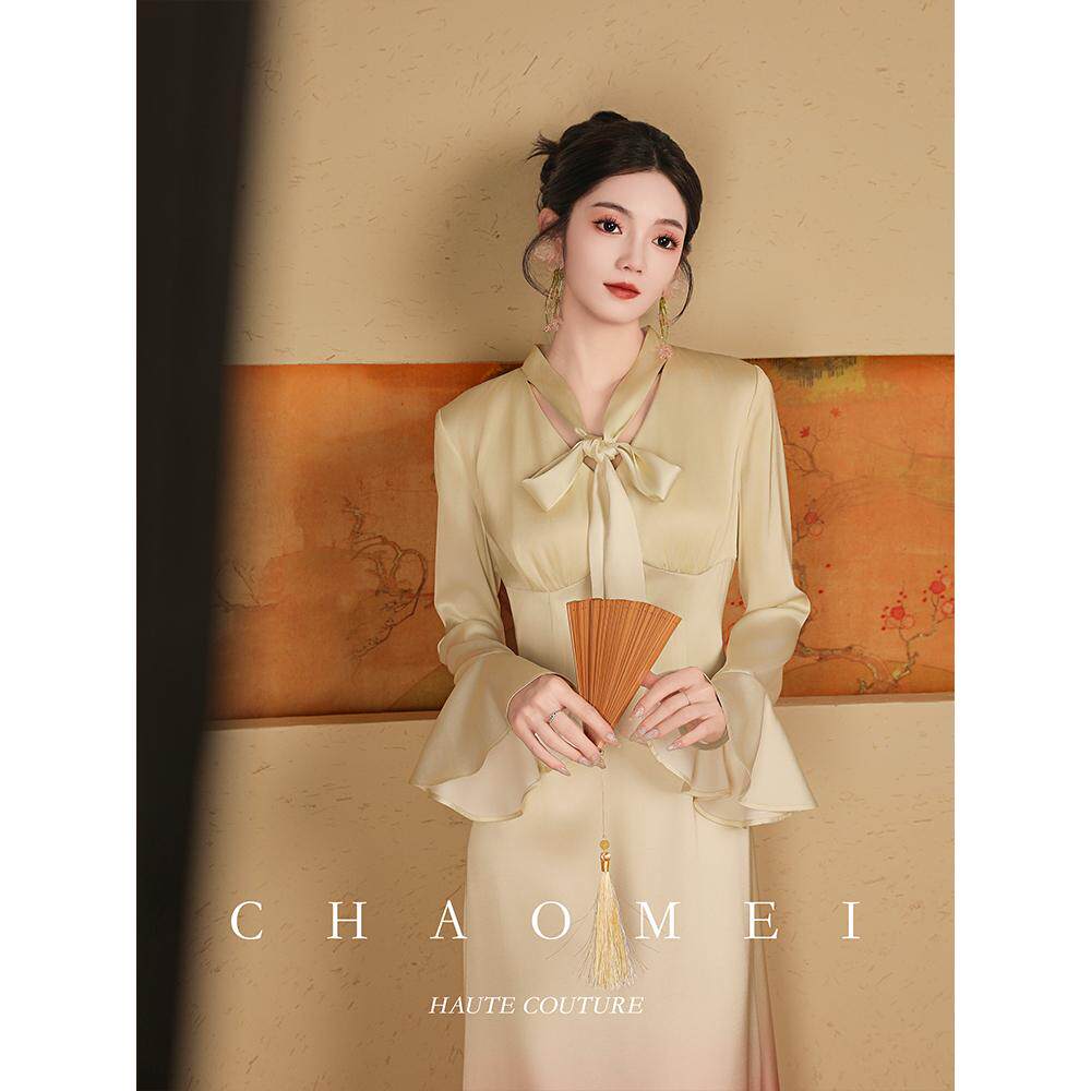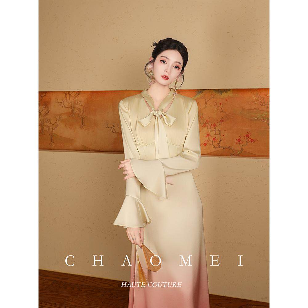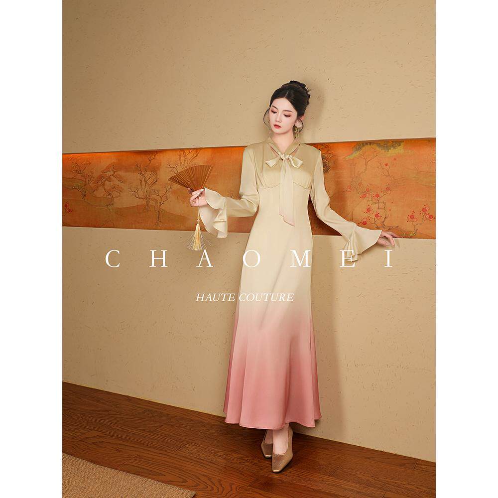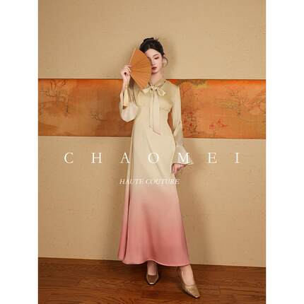 新年特惠【双鱼座】春装渐变粉连衣裙气质长袖收腰新中式长裙