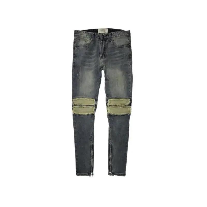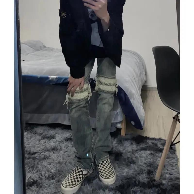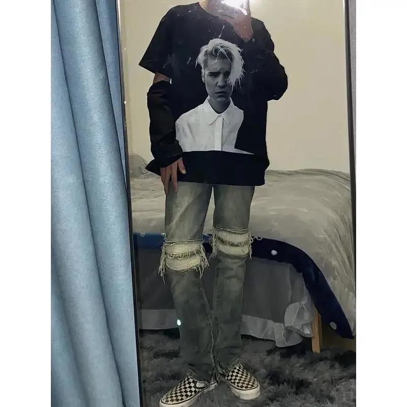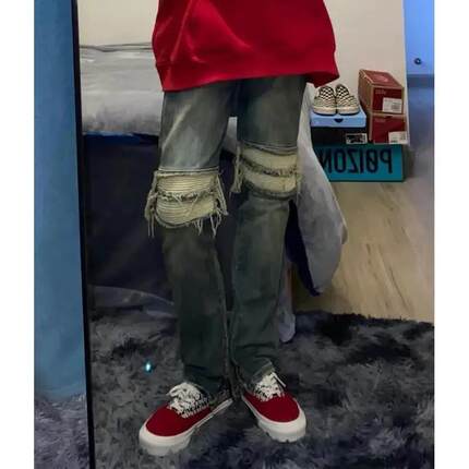 复古高街嘻哈大码牛仔裤女夏季新款膝盖破洞拉链设计修身直筒长裤