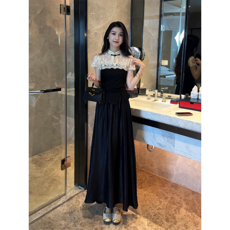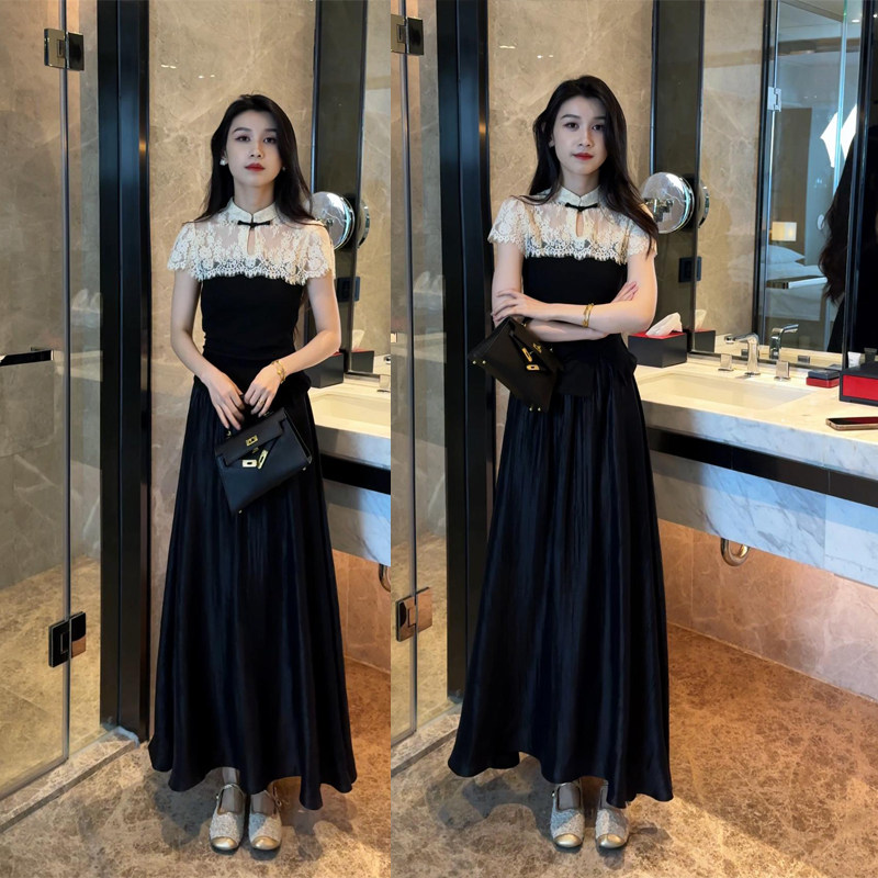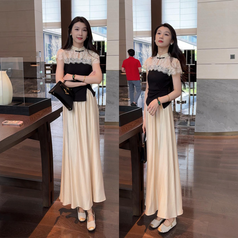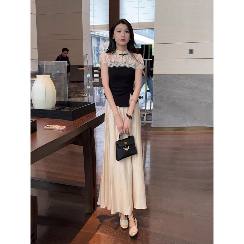 夏季女款套装新中式高级感蕾丝气质上衣+休闲A字裙半身裙两件套装