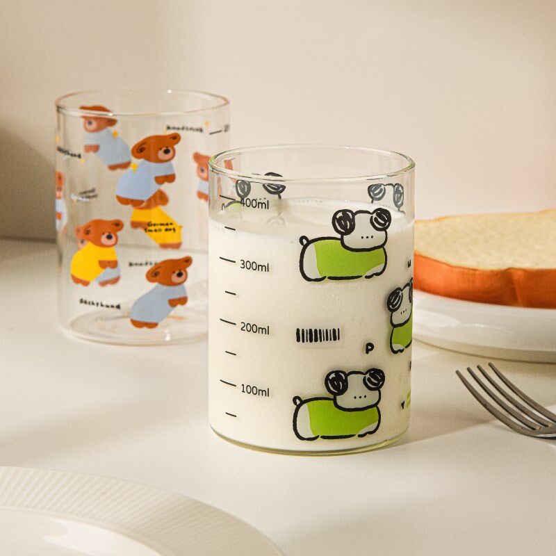 可爱卡通玻璃杯带把手刻度早餐牛奶杯家用喝水杯直身果汁杯啤酒杯