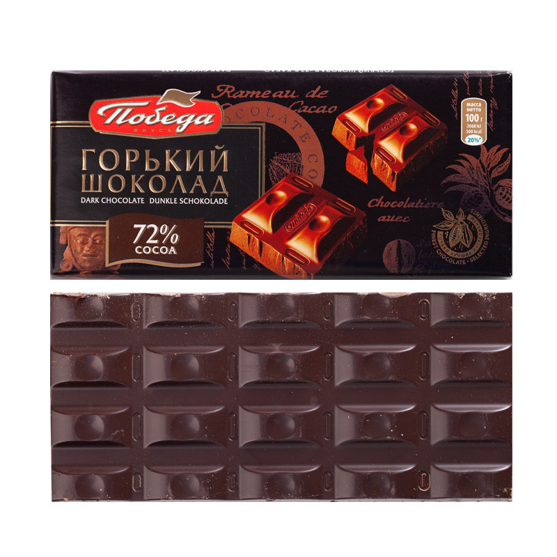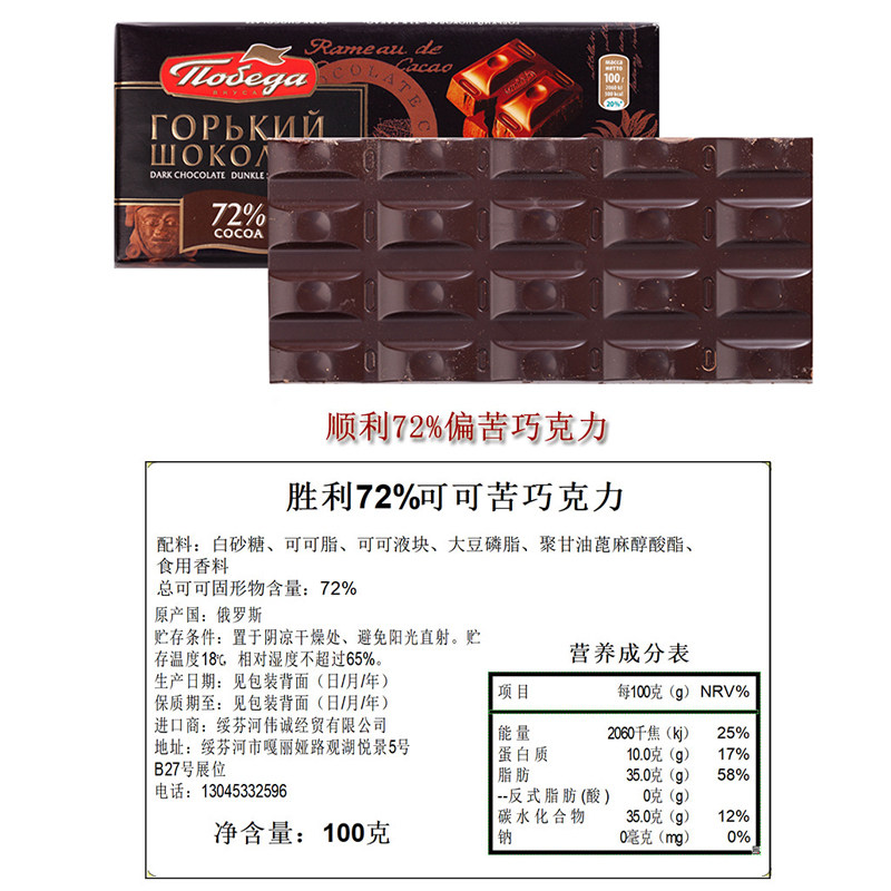 进口黑巧克力俄罗斯胜利品牌72%85%100%低糖纯巧克力休闲零食100g